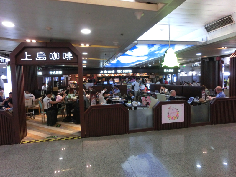 とりあえずゲート前に行く。多くの人で賑わっているが、ゲート近くにカフェがあるのでここで過ごしますか。搭乗予定が18時、2時間近くあるのでのんびりできる、と思って日記書きとかいろいろやってたら、あっという間に18時となった。搭乗が始まり、まもなくLast Callの表示が。急だなあ。機内は約半数ほどの混み具合かな。では上海までの約2時間、のんびりすごしましょう(38)。