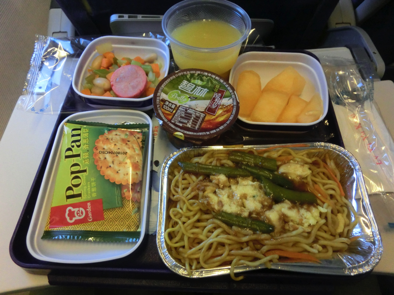 睡魔には簡単に負けて、いつの間にか空の上。しばらくすると、機内食がスタート。例によってまず中国語で聞かれるので、英語にてよろしく。どうやらチキンとライスか卵とヌードルかの選択で、ライスプリーズと言ったはずだが開けてみるとヌードル。まあいいけどね。そんなに期待していないし、まあその通りの味かな。付け合わせの野菜がセロリも入ってて食べ応えがあるぞ。あとは水ではなく酸梅水、思ったほど甘くも酸っぱくもなくこのくらいならいいかな。食後にコーヒーをいただいたところ、ミルクも砂糖も入ったミルクコーヒーでした・・・甘い。食後は音楽を聴いたりして過ごす。そして定刻の20時30分、上海・虹橋空港に到着した。