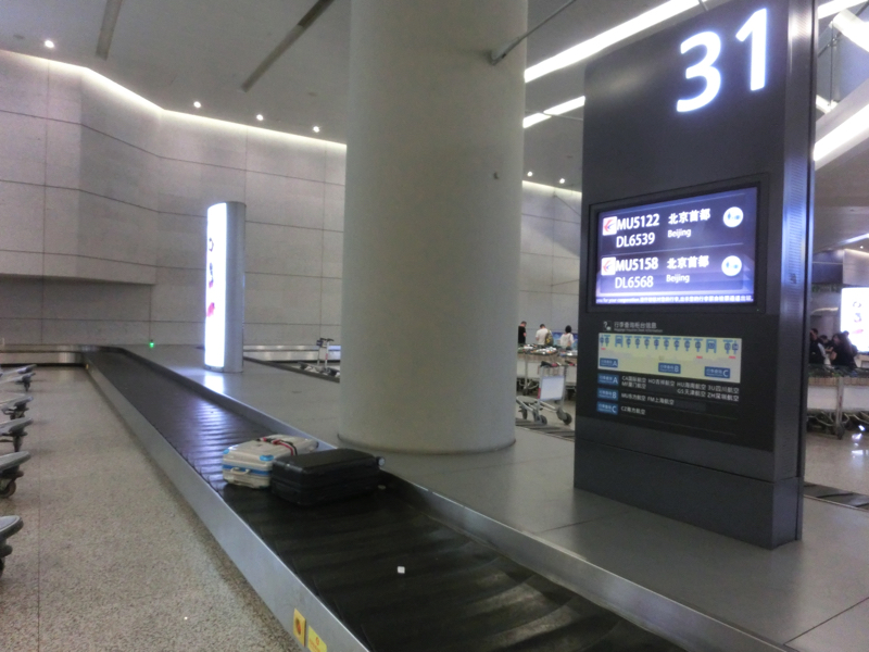 3時ごろ、タクシーを手配いただき空港へ。ここまで暑いとさすがに地下鉄まで歩くのは厳しいからね。ありがとうございました。空港までは40分かからず値段は75、便利だな。第2ターミナルは国内線がメインのようで、中国東方航空のカウンターにてチェックイン。スーツケースを預け、コンベヤにて運ばれようとするところでアラーム音がなり、中に入って荷物を開けてくれと。なんだろうと思ったら、カバンの中にあったデジカメのバッテリーを機内持ち込みにしろと。こんな小さなバッテリーでもわかるんだ・・すごい。水やお茶のボトルもチェックされたが、引火物とか疑っているのかなあ。なんとか無事に荷物を預け、チェックイン完了。中に入りましょう。