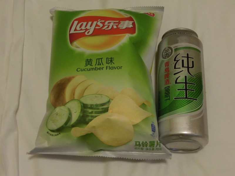 ここから地上に出ると、見覚えのある場所だな。近くにコンビニがあった気がするが、ファミマがありました。ここで明日の朝ごはんと今日のビールをゲット(27)。機内食でわりと満腹なので、ポテチと楽しみましょう。前回も泊まった東湖賓館に到着し、あとはのんびり。ちょっと変わったポテチをと思い、なんとキュウリ味。ほんのり塩味の中にキュウリの青臭い風味がして最初は違和感満開だったが、食べ続けていると癖になってきた。しっかり完食、ごちそうさまでした。さあ、明日はメインの上海事務所だぞ。おやすみなさい・・・