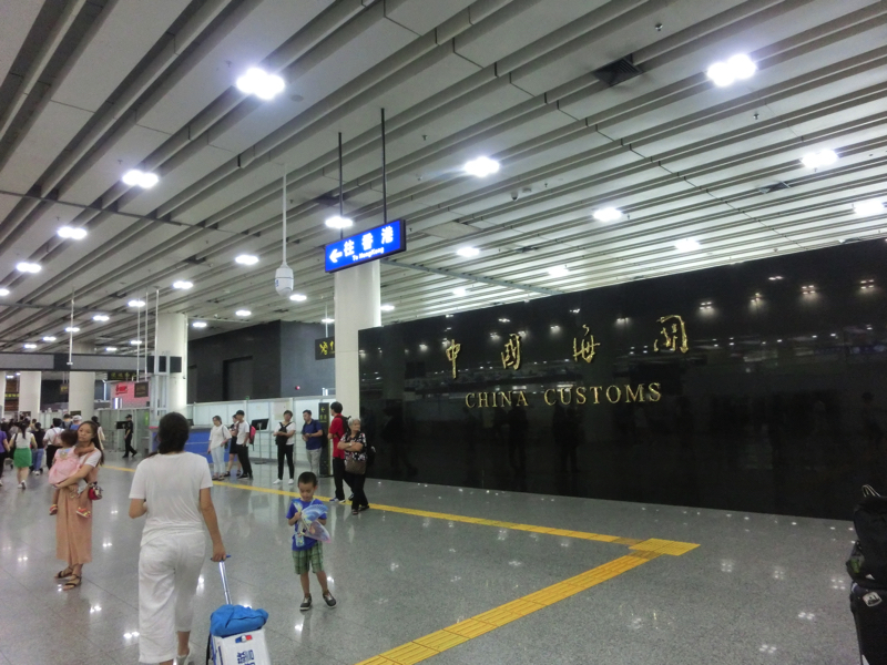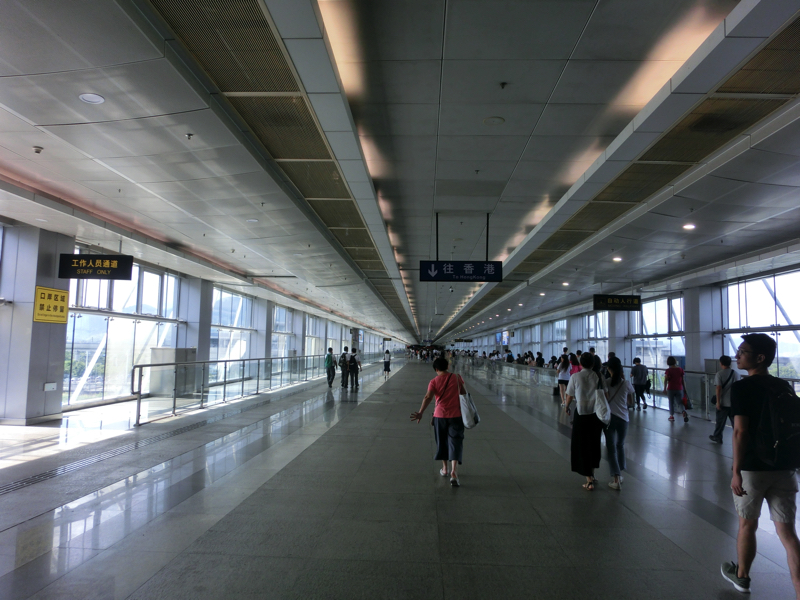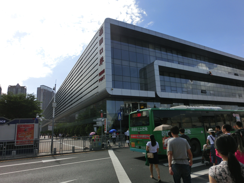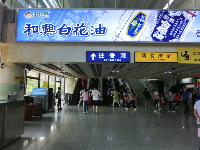 ホテルのロビーでXさんと待ち合わせ。3日前に深圳オフィスに入社したXさんが香港オフィスへの挨拶がてら同行していただけるとのことで、現地の人がいると心強い。ホテル前でタクシーに乗り、国境の福田口港までは20分ほど(31)。ここにある大きな建物が深圳側の国境で、地下鉄でもここまで来ることができる。多くの中国人に混ざって出国手続きを行い、無事に中国を出国。