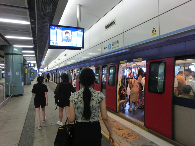 その先は国境。深圳と香港を隔てる川を渡る通路を進み、香港側の入国審査に到着。ここでパスポートを見せれば、それで香港入国。随分と簡単な手続きだ。中国の人もこうして簡単に香港までは行けるわけで、ネットの統制とか果たしてどれだけの意味があるんだろうな。残った中国元を香港ドルに両替すると、103元が106.6香港ドルになった。ほぼ同じだな。ここが香港側の落馬洲駅で、混み合う電車に乗って出発だ。しばらくはジャングルのような中を走るが、それが急に街へと開け、40分ほどで紅磡駅に到着。すぐ向かいに乗り換えの電車が来て、一駅乗って尖東駅。香港の中心街に到着だ。このあとはホテルに荷物を預け、香港オフィスへと出社。