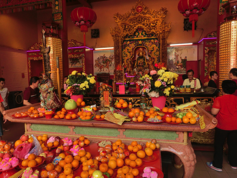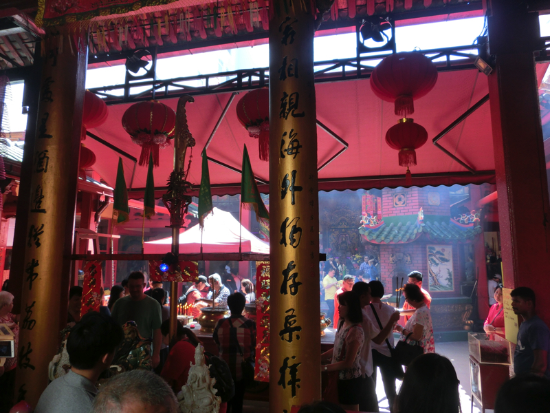 うろうろ歩いていると、関帝廟の前に来た。ここは三国志でも有名な関羽が祀られていて、商売の神様として信仰を集めている。中に入ると線香の煙が立ち込めていて、果物などたくさんのお供えがあってたくさんの人たちがお祈りをしている。商売繁盛を望む気持ちはどこでも同じかな。