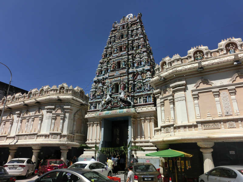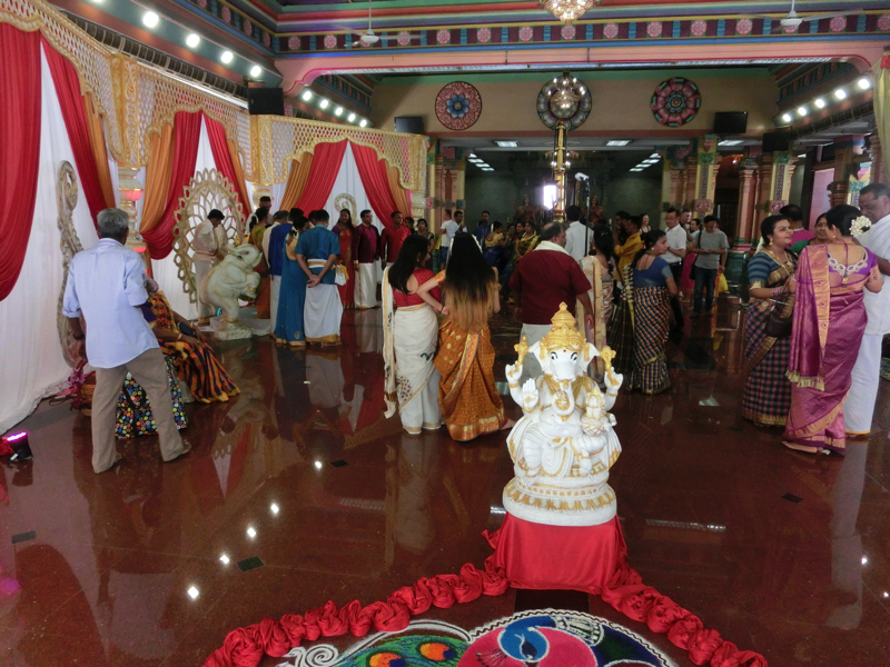 そのすぐ近くにあるのがヒンズーの寺院、スリ・マハ・マリアマン寺院。この前チェンナイで訪れたカーバーレーシュワラ寺院と同じような感じだが、彫刻の色合いはチェンナイのほうがきれいだったかな。例によって靴を預けるが(0.2)、このあたりはインドと違ってちゃんと窓口で明朗会計なので安心だ。裸足で中に入ると、ちょうど結婚式がやってました。きれいだな。この建物の感じや天井の装飾など、ヒンズー寺院ってこんな感じなんだな。