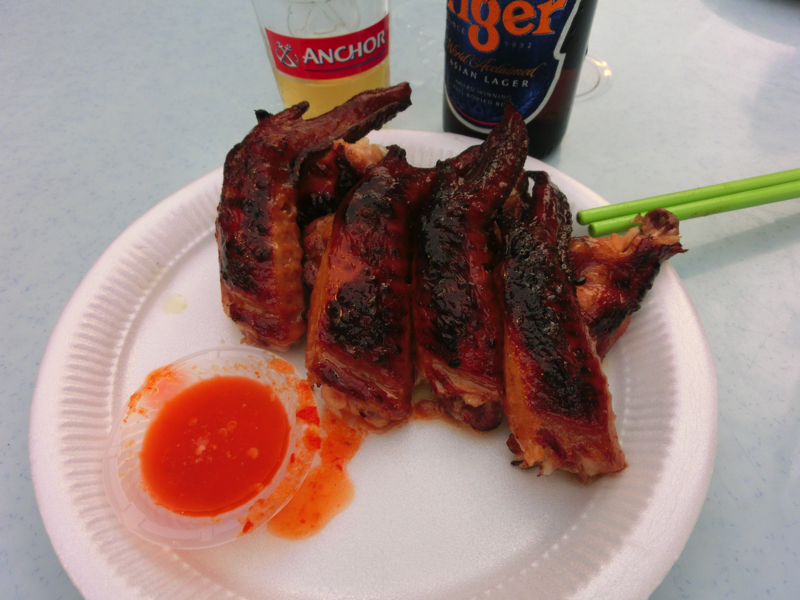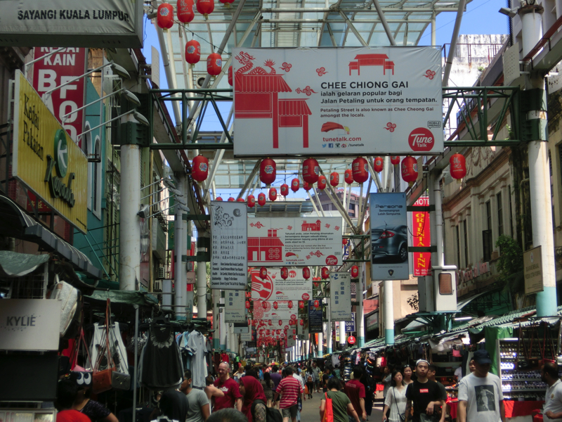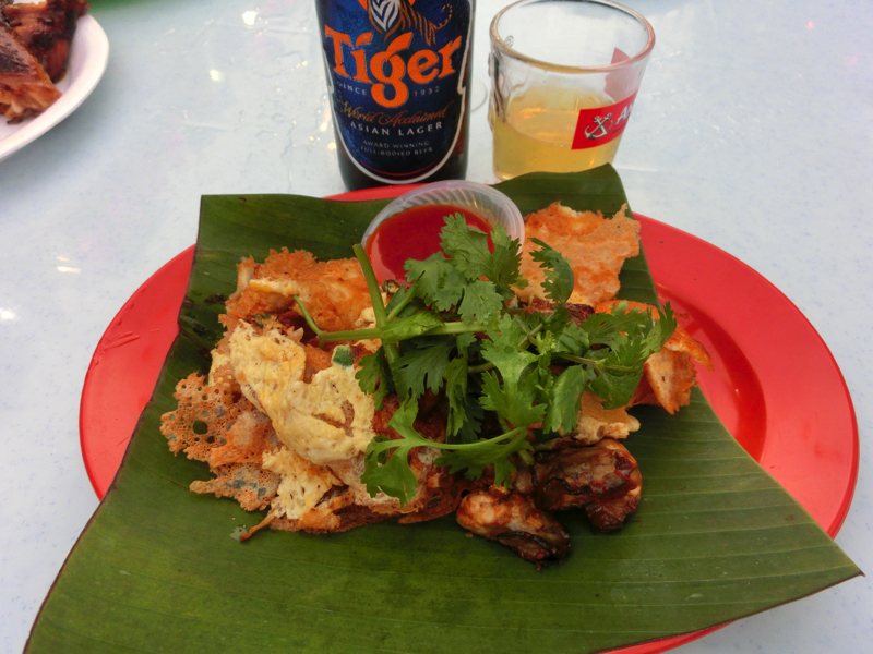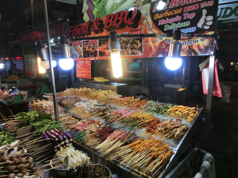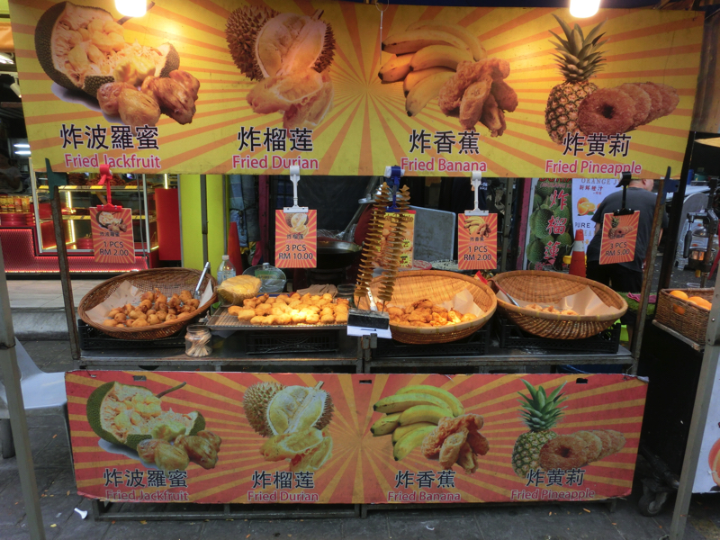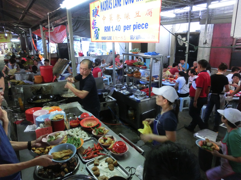 そろそろお昼ごはん。麺など食べられるお店もあるが、もうちょっとチャイナタウンの中へと入って行こう。すると人が集まっているエリアがあり、どうやらここが屋台街。ローカルの人が多い、なかなかのディープスポット。やたらと行列のあるお店があるので並んでみる。見ていると、好きな具を自分で取ってそれがおつゆとともにいただける、要するにおでんのようなものかな。これはヨンタウフというらしく、どうやら有名店のようだ。どの具を選んでも一つ1.4なので、5つ選んでみよう。豆腐っぽいのがおいしそうだし、野菜も大きくて食べ応えがありそうだ。よくわからないままに選び、よくわからないままおばちゃんに案内されて席に着く。さっぱりしたおつゆを味わい、まずは巨大なオクラ。中にミンチ肉が挟まっていて、これはおいしいぞ。豆腐のようなものは厚揚げと高野豆腐の間のような食感で、おつゆを含んでこれもうまい。そしてゴーヤ、これだけ大きいとしっかり苦みが感じられていい感じ。なすは揚げているので甘みがあっておいしいし、魚のすり身は見たまんまでうまい。これは新発見、いい感じだ。一緒のテーブルになったにいちゃんは10個くらいとってたな。どれも食べたいけどね。おつゆまでしっかりいただき、ごちそうさまでした(7)。