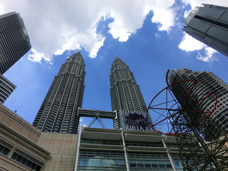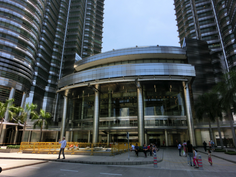 地下からつながるSURIAというショッピングモールに入るが、ここがどうやらKLCCの下層部分のようだ。まずは外に出て、写真を撮りたいがやはりでかいなあ。高さは452mあるらしく、建設当時は世界で最も高い建物だったとのこと。今はKLCCの北側にいるが、あとで南側の公園に行くのでそこからだと全体像が撮れるかな。