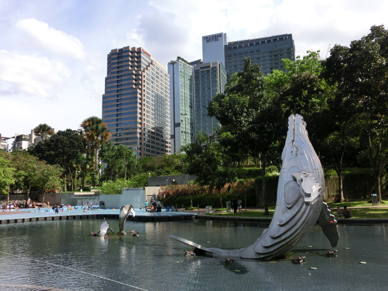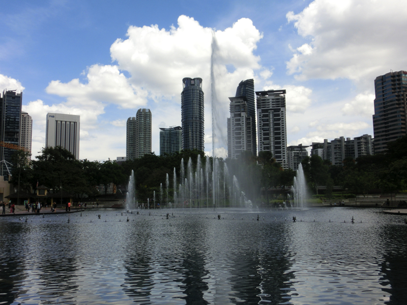 そういえば、KLCCの上にも登れるはず。地下にある受付まで行って見ると、なんとほぼ予約でいっぱいで、夜の19時や20時に少し空きがある程度。うーん、それは遅すぎる。まあ仕方がない、今回はあきらめよう。KLCC前の公園に行ってみる。大きな池があり、ちょうど噴水ショーの真っ最中。暑い中で、涼しげでいいですね。その池の超えたくらいの場所ならばKLCC全体が写真に収められる。天気もいいし、いい感じです。しばらく公園をうろうろのんびりして、やっぱり暑いのでKLCCに戻る。