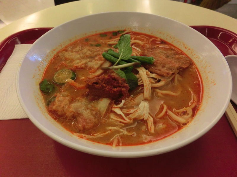 そろそろおやつタイム、もぐもぐタイムかな。3階のフードコートには、マレーシアやタイなどのアジア料理、中華やハンバーガー、ピザなどいろんなお店がある。ここは麺かな。イポーの麺屋さんがあったのでここにしよう。カレーミーというカレー味の麺がおいしそうだ。具だくさんの一杯は、想像以上にうまかったです。スープの程よい辛さとライムの酸味、魚介のエキスも感じられて厚揚げのような具とか野菜とか、これはうまい。スープまでしっかりいただきました(10.3)。ふー、また暑くなった。