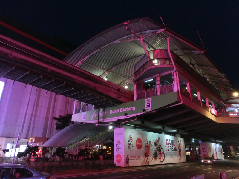 アロー通りはどんどん賑やかになってくるようだ。ではモノレールに乗って帰りますか。これは高架なので、途中に夜のKLCCが見えました。暗い空にそびえたっているようで、やっぱりツインタワーというのが迫力を感じますね。セントラル駅に到着し、駅前のコンビニで朝ごはんを仕入れよう。