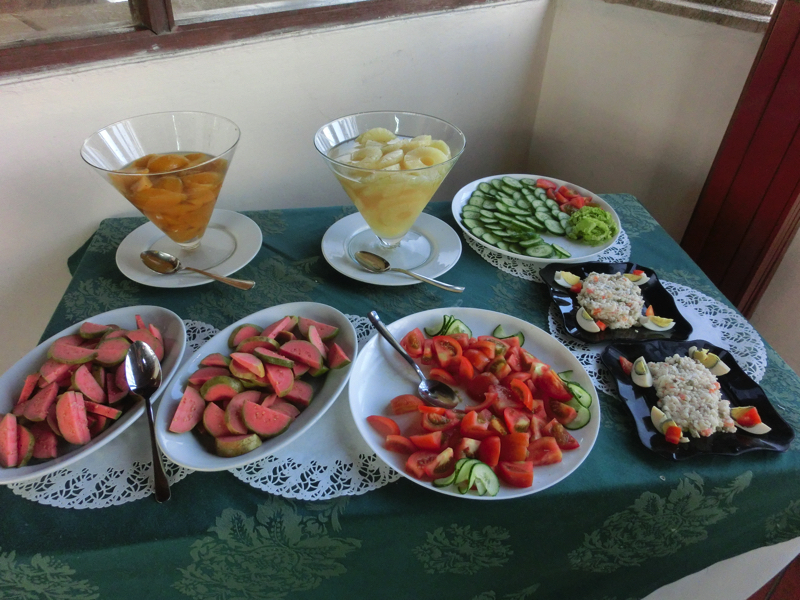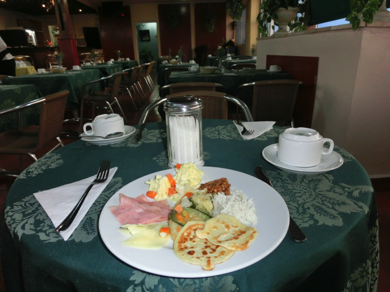 1時間寝ては目が覚め、また1時間寝ては目が覚めの繰り返し。まあ、ここまで時差の大きなところに来るとこうなるな。6時前になったので、もう起きますか。シャワーを浴びるが、どんな感じか・・・勢いは十分だが、ほぼ水。ほんのり温かいことは温かいが、これはほぼ水シャワー。でもこれは想定の範囲、仕方ないので頑張って浴びよう。マンチェスター以来かな。とにかくさっぱりしたので、7時過ぎに朝ごはんへ。5階の最上階が朝ごはん場所だが、オープンエアの気持ちのいい場所。部屋の暗さとは大違いかな。歴史ある建物が朝日を浴びているのが見える。ビュフェはそれなりにそろっていて、ハムやチーズは一種類ずつだが温かいおかずの野菜がたっぷりでおいしそうだ。一通り取っていただく。どれもやさしい味わいのおいしいおかず。これはいい。目玉焼きも作ってもらい、朝からたっぷり栄養補給。安宿だが、このくらいの朝ごはんが食べられたらOKです。ごちそうさまでした。