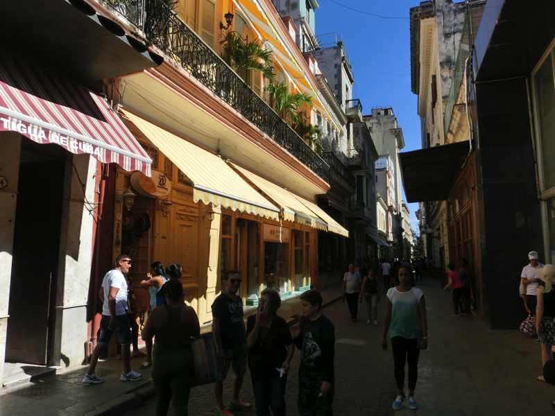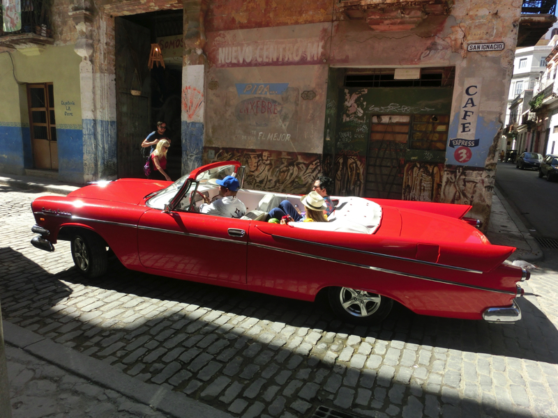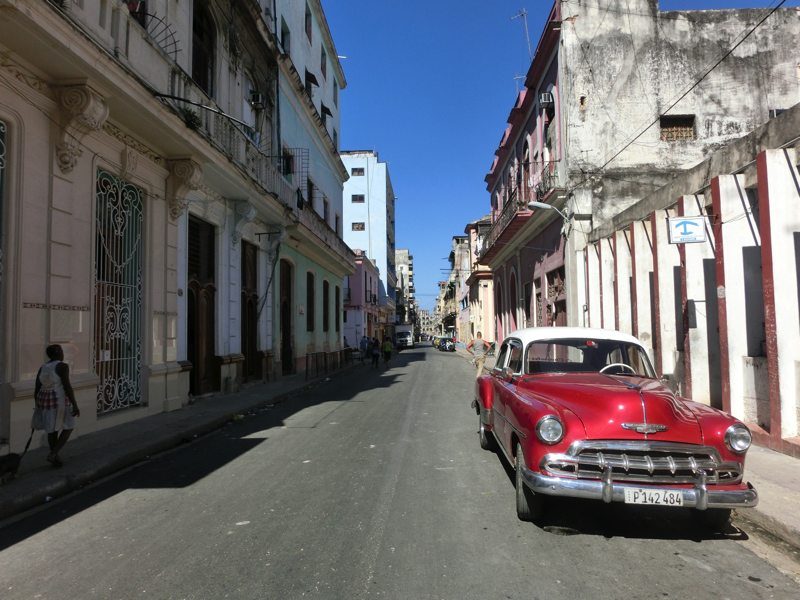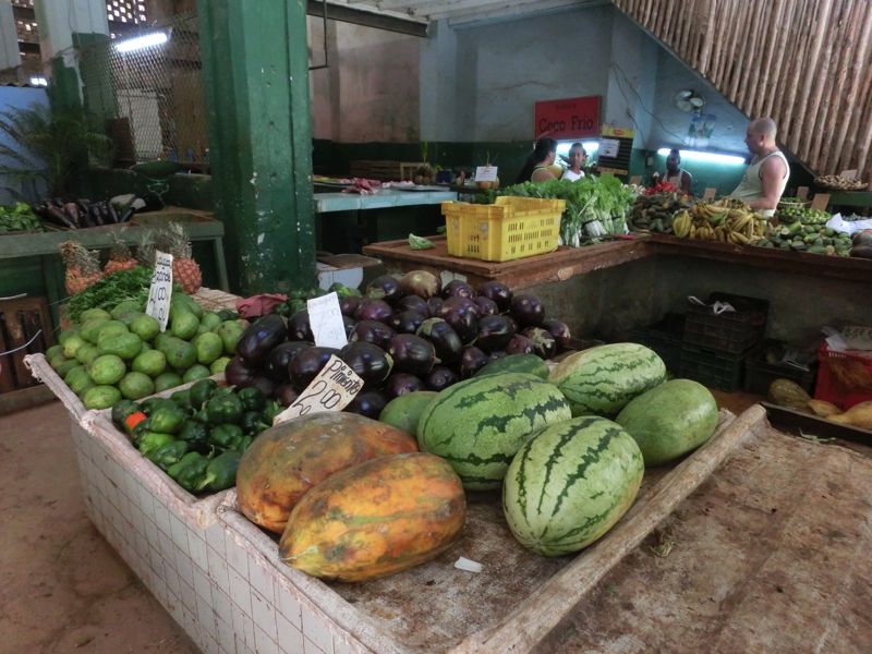 どんどん歩こう。途中のマーケットでは、缶詰やお酒、パンくらいしかない。地元の人は基本は配給制と聞くが、どうやって生活しているんだろうな。薬屋さんがあったが、陶器の壺が並ぶ格調高い雰囲気。同じドラッグストアでも日本のお店とは全然違いますね。カテドラルの近くまで戻ってきたので、ここからは南に向けて歩いて行く。途中に野菜のマーケットがありました。地元の人にとって高いのか安いのかはわからないが、野菜がちゃんと売っていたのでちょっと安心。あまり広くはない通りだが、こんなところにもクラシックカーが走っている。これは旧市街散策のタクシーで、こうなると見世物のようで、乗っていても落ち着かないのではと思ってしまいます。