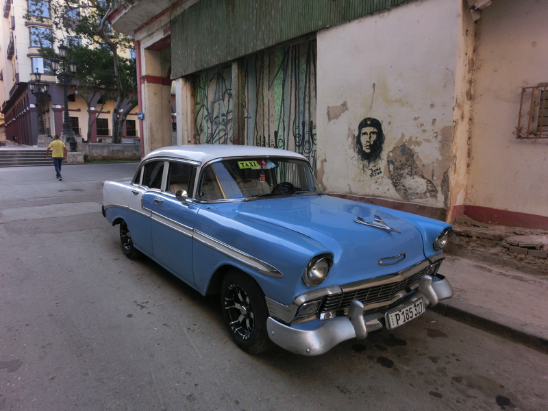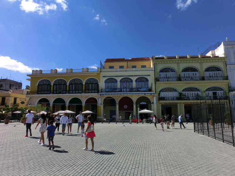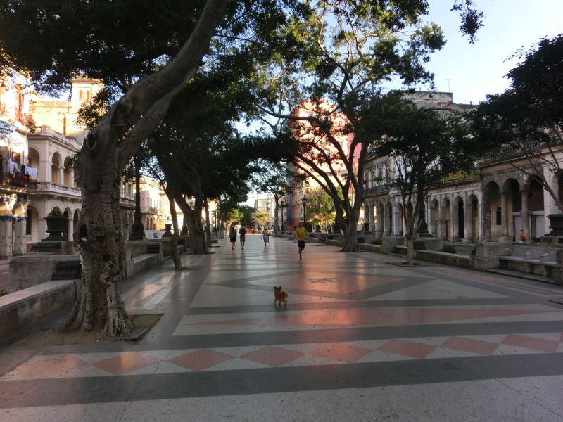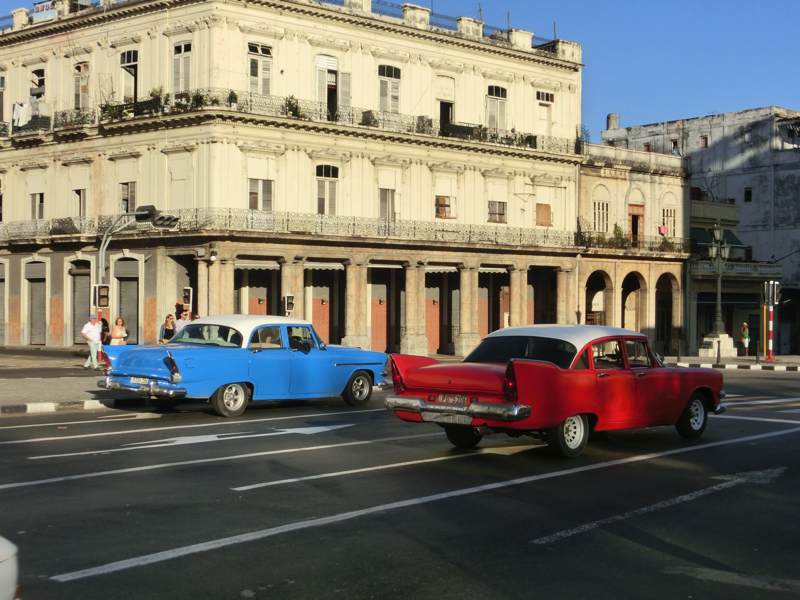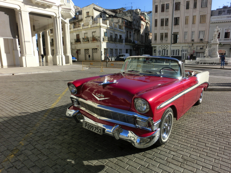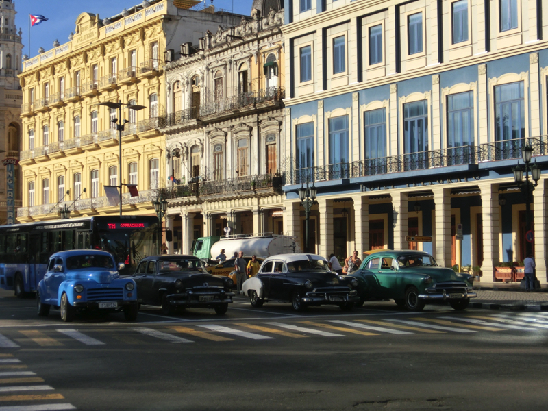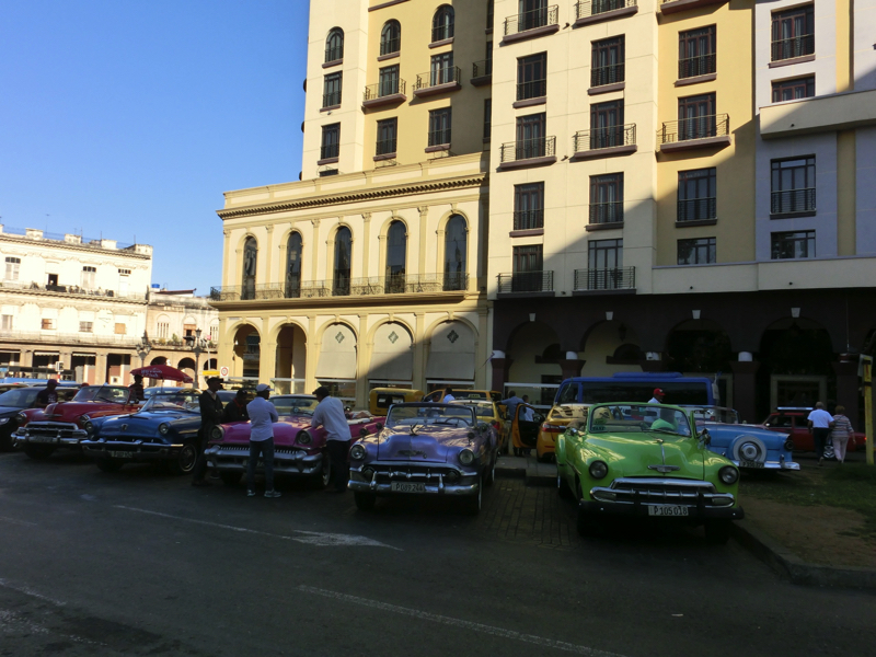 少し歩くと、セントラル公園に来た。ここの周りはまさにクラシックカーの見本市、たくさんのカラフルなクラシックカーはタクシーで、客引きのためにここに集まっている。そこら中から声がかかるが、基本歩きなもので。クラシックカーが集まっている様子は興味があるが、車種などわからず特に乗らなくてもいいと思ってますんで。道を見ると、次から次へとクラシックカーがやってくる。なんとも不思議な景色だが、こんな景色もアメリカとの国交が正常化した今、10年後にはほぼ見れなくなっているのかもしれない。今のうちに、この景色をしっかり見ておきましょう。このあたりで写真を撮っている合間にも、たくさんのクラシックカーが目の前を通る。早くもこれが普通になってきたぞ。朝ごはんの時はちょっと肌寒いかもとも思ったが、今はもうすでに暑い。ということで街歩きを一旦やめ、ホテルに戻る。これからずっと歩くので、上着など余計な暑いものは置いていきましょう。