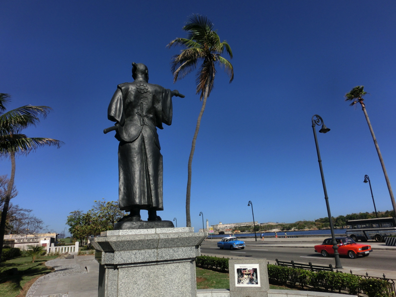 それより日本人的には、支倉常長像。キューバの地を踏んだ初めての日本人とのことで、日本風の庭園の中で目的地であったローマの方を扇子で指している。当時の苦難はどれほどであっただろう。ローマに到着し、ローマ法王への謁見後日本に帰国するが、自分を派遣した伊達政宗がすでに禁教となっていたキリスト教を忌むことで自分を受け入れてくれなかったことはさぞ無念であっただろう。そんな思いも含めて、日本人初の足跡を残した支倉常長の偉業をたたえたい。そしてこの像がいつまでもこの地にしっかりと存在してくれたらいいな。