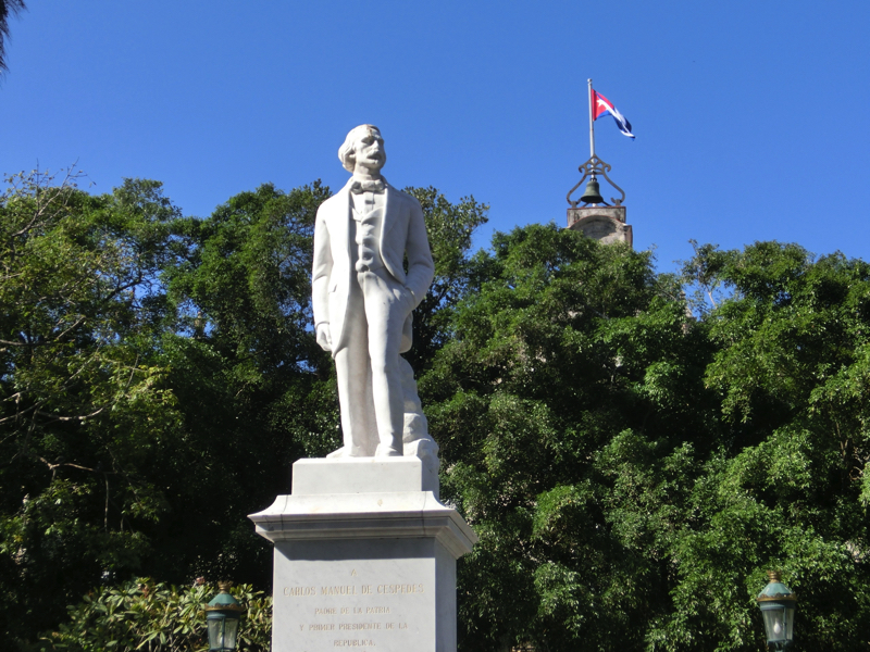 その向かいにあるのがアルマス広場、その中央にはキューバ第一次独立戦争のリーダーであったカルロス・マヌエル・デ・セスペデスの像が立っている。後ろにある市立博物館(旧総督官邸)にはためくキューバ国旗と重なって見える。これまで知らなかったが、キューバの人にとっては誇り高い人物なんだろうな。
