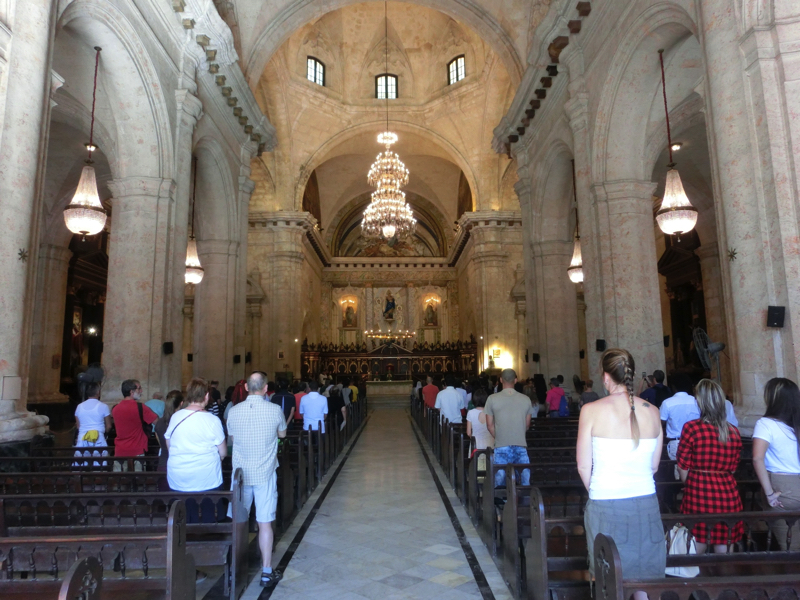 広場から少し歩いたところにあるのがカテドラル。18世紀初頭に建築された教会で、キューバ風バロックスタイルとのこと。中に入るとちょうどミサが行われていたので、後ろの端っこで少しだけ参加。外の日差しを避けられるし、教会の荘厳な雰囲気の中で気持ちがリフレッシュされました。