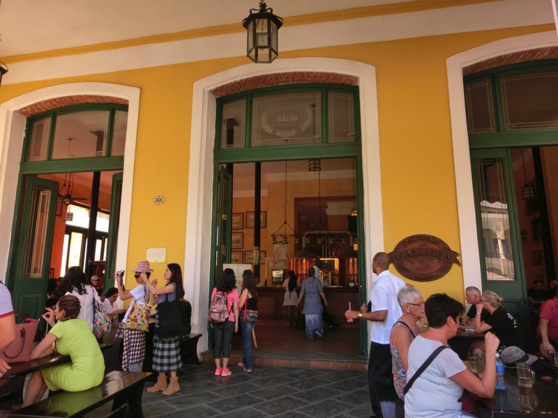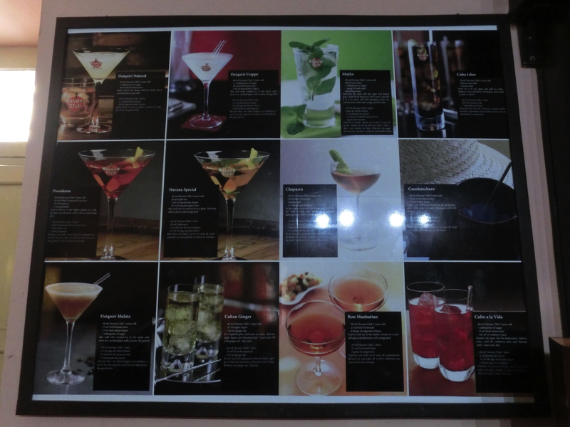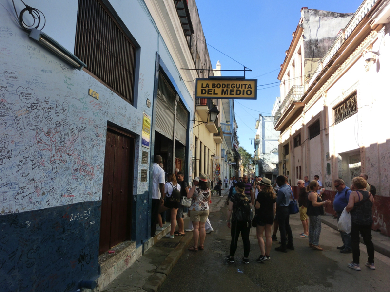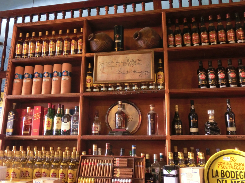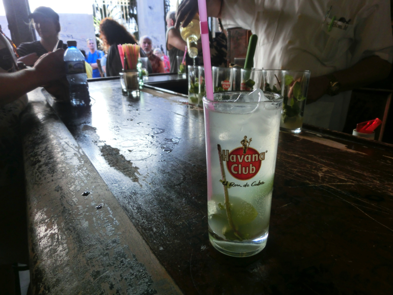 この時点で、まだ11時前。小腹はすいてきたが、どこも昼ごはんにはまだ早い。早起きしたつもりもなかったが、意外とここまで早く来たなあ。カテドラル前の道を行くと、お土産屋さんなどが並んでいてそんな中にあるのが、ラ・ボデキータ・デル・メディオ。ヘミングウェイが通った店として有名で、中の壁にはヘミングウェイの写真やサインが飾られている。そんなお店の中ではバンドのライブ演奏が行われていてとても賑やかだ。中に入り、ここで頂くのはモヒート(CUC5)。最近日本でもはやりのようだが、本場でぜひ飲んでみたい。ここはお客さんが多いこともあり、グラスを並べて流れ作業のようにラム、ミント、氷、炭酸がグラスに入れられていく。ミントを入れた後にスプーンですこし押しつぶすようにするのが風味のポイントかな。ではヘミングウェイゆかりのバーにてライブを聞きながらモヒートというこれぞキューバなひと時を楽しみましょう。モヒートはさっぱりしていて、たっぷり入ったミントがさわやかだ。アルコール度はさほど強くなく、太陽のもとで気持ちよく飲めそうだ。