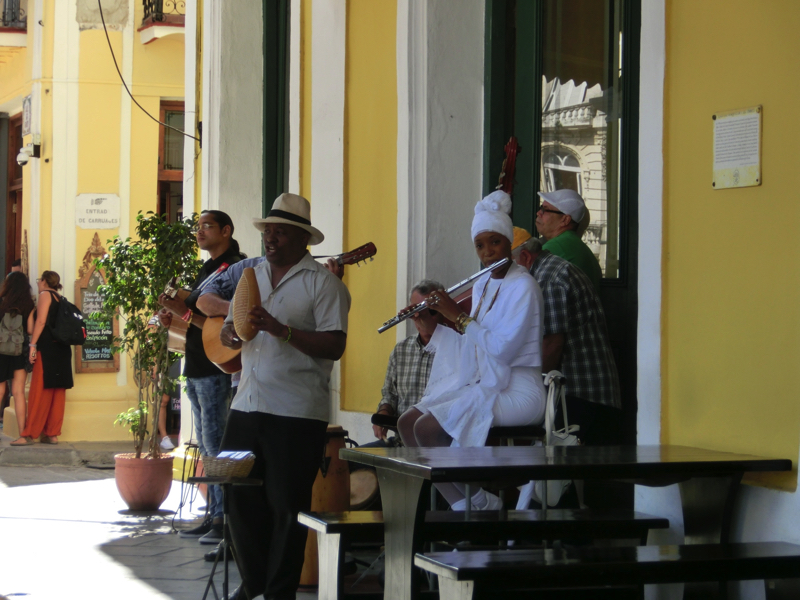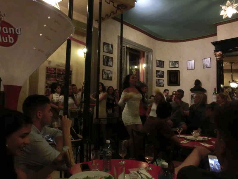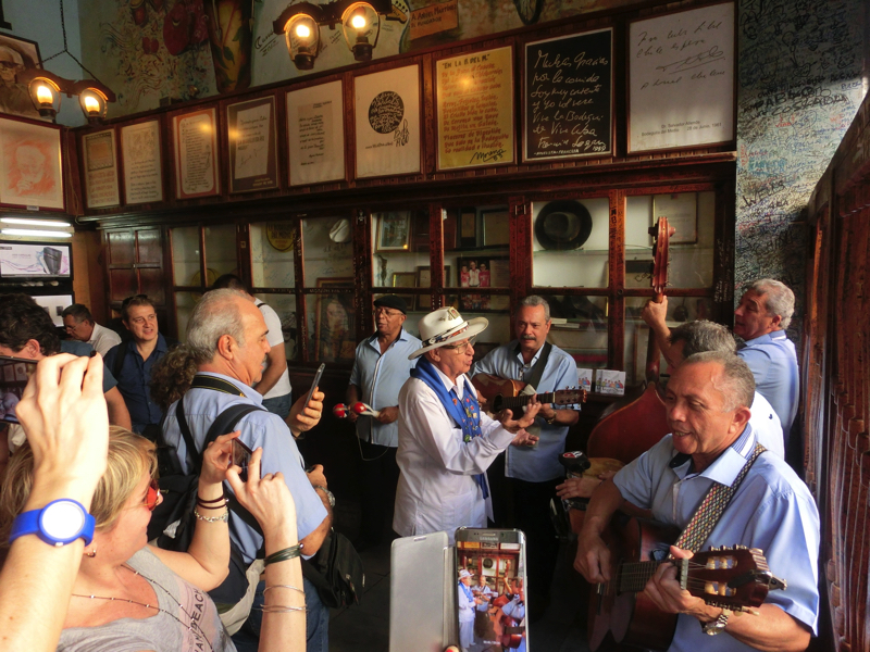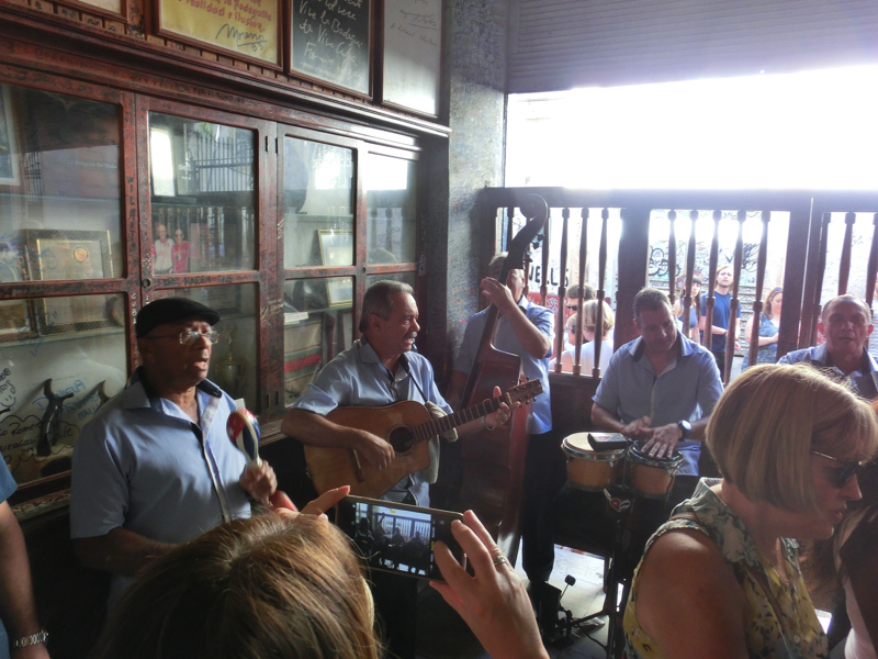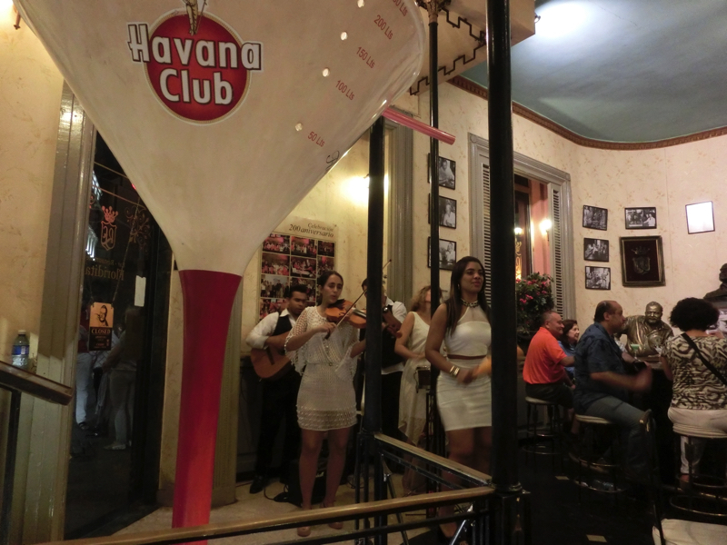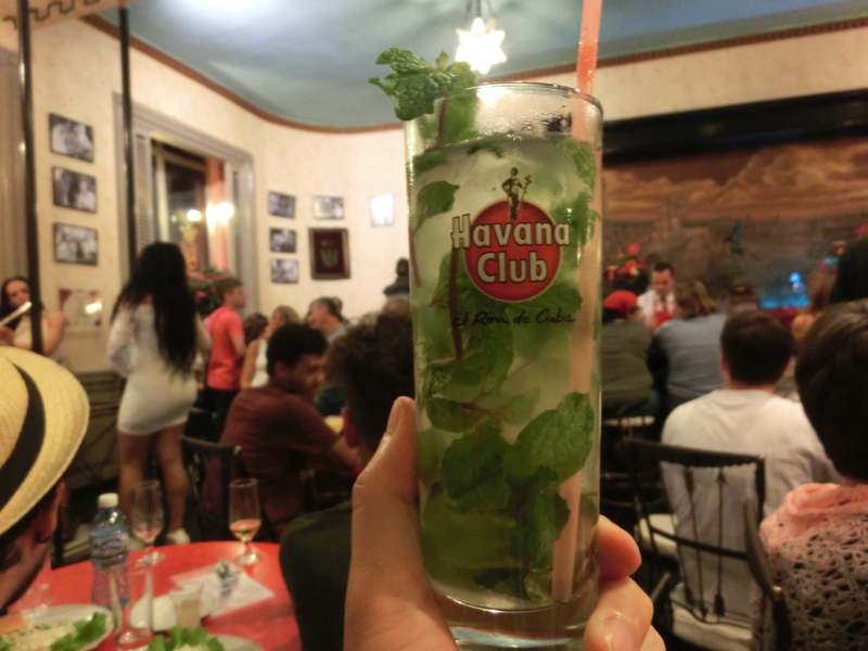 食後はそのままフロリディータへ。賑やかな音楽が聞こえるが、さっきよりはちょっと空きができたようですぐに入ることができました。でもたまたまのタイミングだったようで、そのあとすぐにいっぱいになったけどね。ここはまず、ヘミングウェイが愛したというダイキリをいただく。冷たくさっぱりしてフルーティーでおいしいです。ライブも盛り上がっているし、ハバナの夜、という雰囲気だ。ダイキリを飲んだ後は、やっぱりモヒートだよね。ミントがたっぷり入ったモヒート、さわやかな味わいだ。ダイキリもモヒートもベースがラムなので、ほんのり甘みがあるのも飲みやすくていいな。ライブはまた違うグループになって盛り上がっている。こうしてハバナのたくさんのバーやレストランで、毎晩バンドがライブを行っているんだな。今日一日、いろんなキューバを楽しむことができてよかったです。ごちそうさまでした(12CUC、バンドへのチップ3CUC)。
