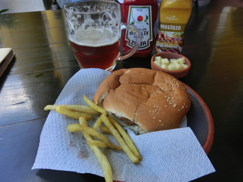 しばらく歩くと広場に出た。ここがビエハ広場で、周りにはカフェやレストランなどがあるちょっときれいな広場だ。ここにあるのがファクトリア・セルベサス・イ・マルタスという地ビールレストラン。入りましょう。ビールは3種類で、ライトとアンバーとダークがあるのでまずはアンバーをいただきましょう。昼ごはんなので、ハンバーガーも一緒に頼む。しばらくしてビールが登場、丸いジョッキに入っている琥珀色がいい感じ。少し香ばしさを感じ、地ビールらしいコクと苦みがあっておいしい。付け合わせなのか、小鉢にチーズが出てきました。4人テーブルでも1人テーブルでも同じ量が来ているようなので、お得だな。ビールによくあう、食べやすいチーズでした。しばらくして出てきたのがハンバーガー、これは期待外れにしょぼい。少しだけのポテトもまたしょぼさ感を増している。ケチャップとマスタードをつけるのはホットドッグ感覚だが、多めにつけていただきましょう。肉のパテが柔らかくて何の肉はよくわからない感じだが、なにせこれ2CUCなのでこんなものなのかな。まあこれもキューバ体験ということで。ビールが3CUCなので、広場に面したいい感じのお店のランチが5CUCで終了。安いし、ゆっくりできたし、よかったです。ごちそうさまでした。