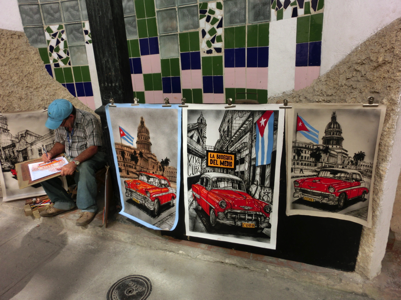 では街歩き再開。旧市街の細い道を歩き、やってきたのがオビスポ通り。ここは旧市街で最もにぎやかな通りで、たくさんのお土産屋さんやカフェ、レストランなどが並んでいる。まずは民芸品市場へ。まあ、買うものはないと思うので雰囲気を楽しみに。アクセサリーや革細工、銀細工などのほかにチェゲバラのフィギュア、クラシックカーのミニカー、キューバデザインのTシャツなどありました。クラシックカーのミニカーなんていいが、ちょっと大きすぎ。チョロQサイズがあれば買ってたかもね。