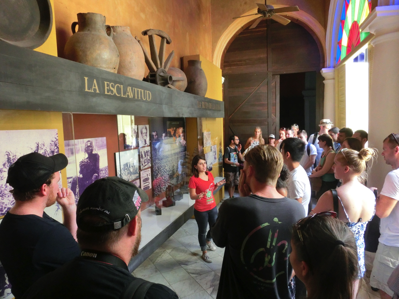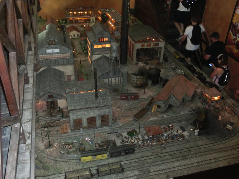 今は13時を回ったころ。次の目的地は、ハバナクラブ博物館。ラムの製造工程が見学できるのだが、行ってみると次の英語ガイドは14時とのこと、ちょっとまだ時間があるので、ビエハ広場の日陰にてしばし休憩。湿度がそれなりにあるので日陰でもそんなに涼しくはならないが、昼の強い日差しを避けられるだけでもありがたい。20分ほど前になったところで、このあたりのお店をぶらぶら見つつ博物館へ。ちょうど10分前くらいに到着、他にもお客さんは結構いそうだ(7CUC)。室内でしばらく待ち、14時から見学ツアーがスタート。サマンサさんという小柄なキューバ女子に案内していただきます。最初は映像でコロンブスの到着からキューバでのサトウキビ栽培、砂糖の製造からラム酒になるまでの歴史を知る。いろんな歴史背景があるもんだ。その後は製造に使っていた器具やその運搬に使用していた鉄道の紹介などあり、そこで煮詰めたサトウキビを少し味見。まさに黒糖のようだ。次の部屋に行くと巨大なジオラマが。サトウキビを鉄道で運び、砂糖を作り、発酵させてラム酒にするその工場設備を巨大なジオラマで表現している。鉄道がところ狭しと走る様子はなかなか精巧だ。