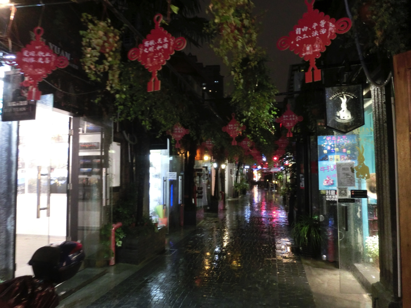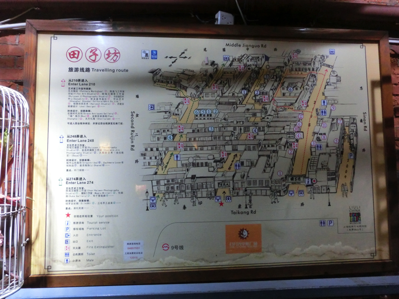 仕事が終了。外は雨だが、上海の観光スポットということで、田子坊というところに連れて行ってもらいました。会社近くの淮海中路駅から地下鉄を乗り継ぎ、打浦橋駅で下りるとすぐ駅前にそのエリアの入り口があり、狭い路地にたくさんのお店が並んでいる。カフェとか雑貨屋さんとかスイーツ屋さんとかいろいろあり、天気のいい昼間にのんびり歩けたら楽しいだろうな。