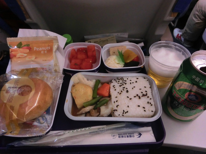 混雑した待合室だが、ようやく搭乗開始。バスで広い空港をひたすら走り、西日を浴びた中国東方航空に到着。乗り込むと、3人席の通路側だがなぜかそこだけ窓際のところが乗務員用になっていて、中国人のおばさんと2人席のような感じ。まあ、それはいいのだが離陸してしばらくするとやたらと話しかけてくるのよね・・中国語で。こちらは何もわからないのに、機内食のパンをくれようとしたり、バターの何かが気になるらしく聞いてきたり、入国カードの書き方を聞いてきたり・・わからん。寝てるところを起こしてまで話しかけるのはやめてくれー!