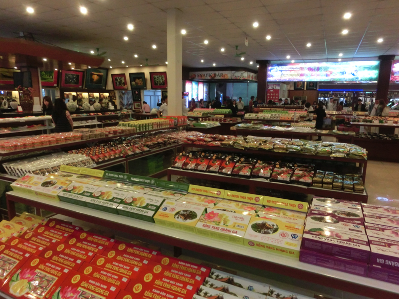 部屋に戻り、準備をして出かけますか。8時半ごろ迎えのバスが来るはずなので、10分ほど前にロビーで待っていると、ほぼ予定通りにバスが到着。といってもマイクロバスで、先客も日本人ばかりで合計12名、ほぼ満席。これで4時間半は結構長いなあ・・ガイドのにいちゃんが片言の日本語で挨拶して、バスはハノイを抜け走っていく。まだ朝も早く、誰が誰かもわからないので車内はほぼ無言のまま。いつのまにやら眠りに落ち、2時間ほど経った頃に休憩タイム。いかにもなおみやげ屋さんで、ベトナムのいろんなおみやげがある。まあ行きに買うこともないし、こういうお店は確実にスーパーより高いので帰りでも買う気はないがどんなものがあるかは見ておこう。なるべく店員さんからは死角になるようにね。