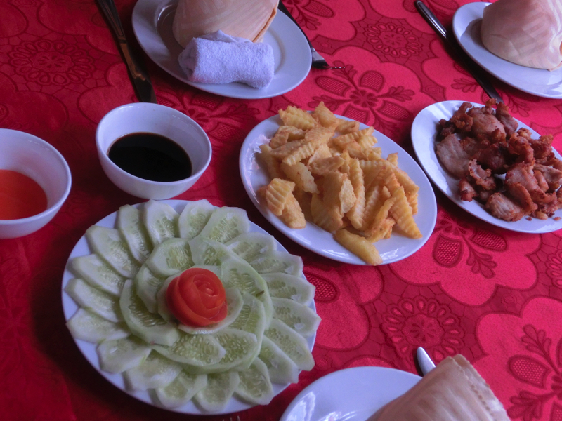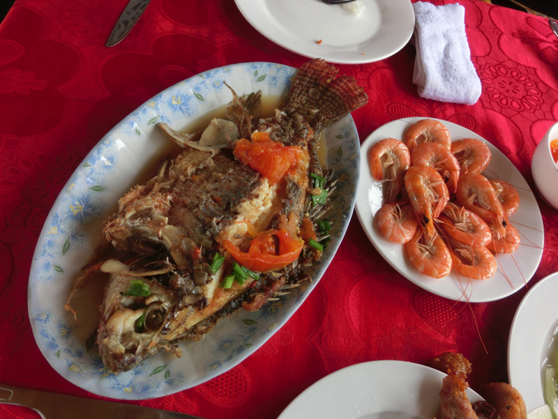 まずはランチタイム。6人テーブルに男子一人なので、女子たちのインスタ用写真に気遣いつつ料理をいただく。ポテトや唐揚げなどのつまみ系のあとはイカと野菜の炒め物、茹でたエビ、大きな魚といったシーフード満載メニュー。船の外にはそろそろ奇岩が見えてきているので、あまりゆっくりも食べていられない。ほどほどにいただき、船の甲板へと出よう。