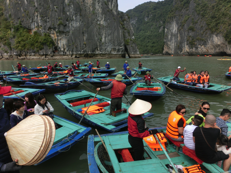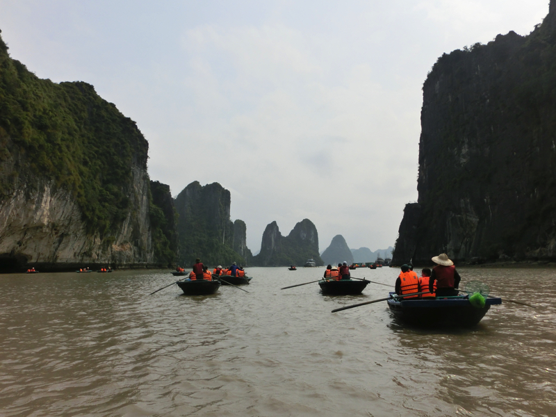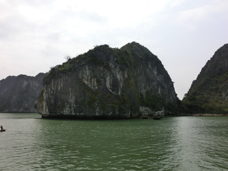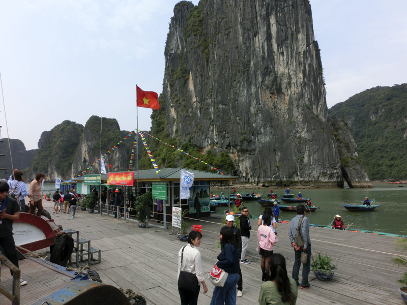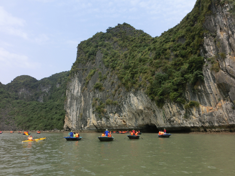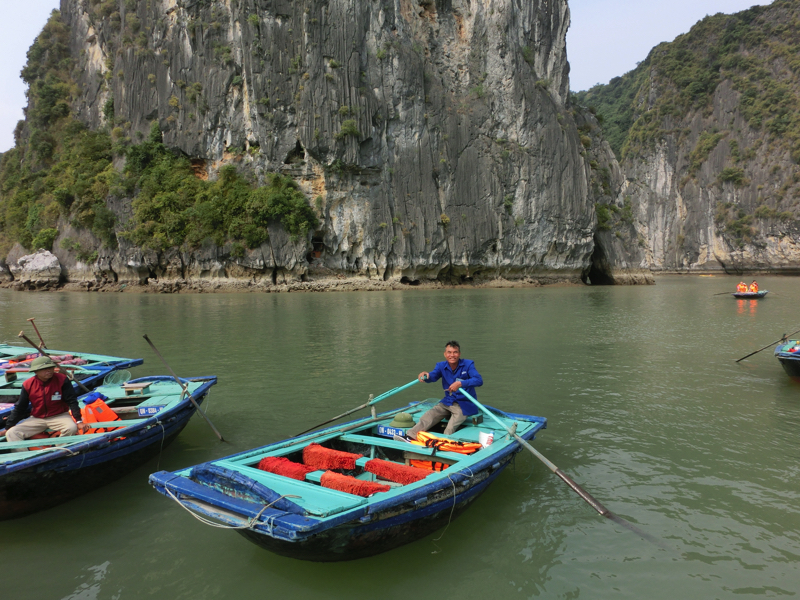 奇岩の間を縫うように船は走り、フローティングビレッジに到着。ここで4人ずつ小舟に乗り換え、奇岩や洞窟を見て回る(200,000)。おじさんが船を漕いで回ってくれるのだが、それぞれのスポットで写真を撮ってくれる。まあ、チップ目当てなんだろうが愛想よくていいよね。干潮のタイミングなので洞窟の中までは船で入れないが、できるだけ近くまでよって見せてくれる。天気もよく、気持ちがいいな。周りを見ると、カヤックで自分で漕いでいる人もいる。さすがにそれは厳しいか。ぐるっと一周して戻ってきた。乗る前にガイドさんから言われていた通り、チップは一人10,000ドン。おじさんは満面の笑みだ。これ、一日やったら結構いい稼ぎになりそうだな。