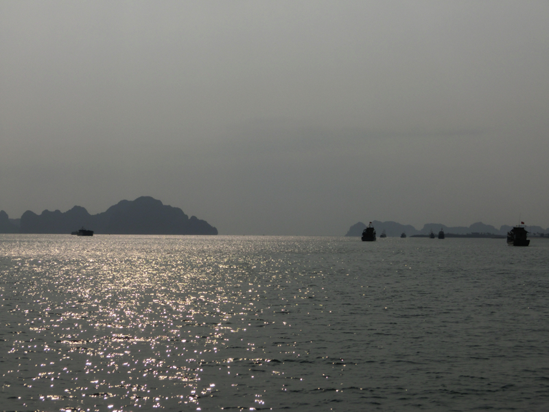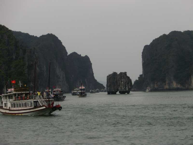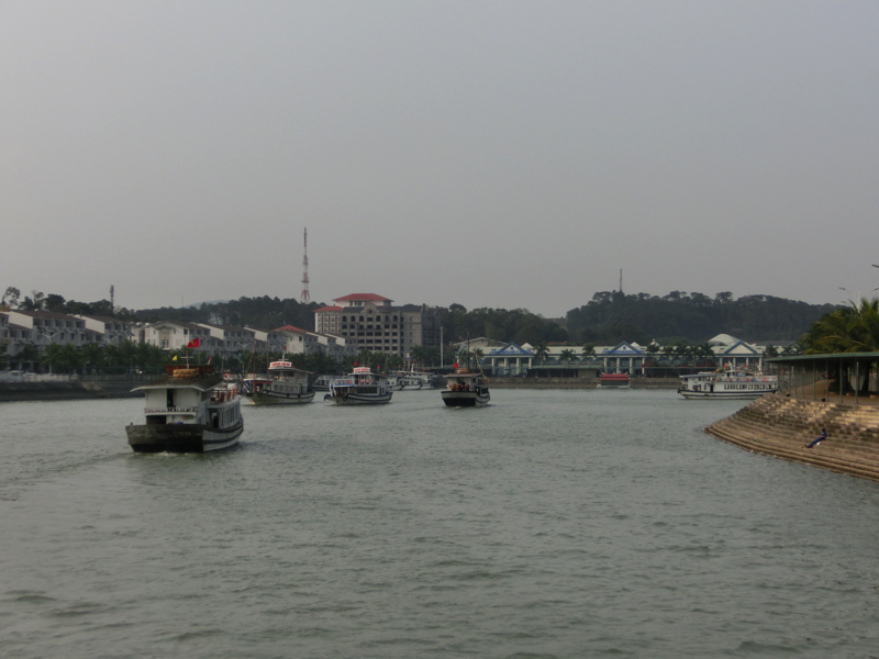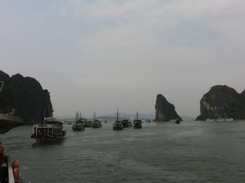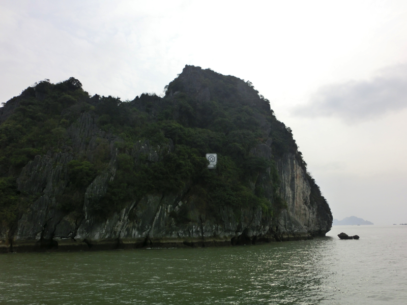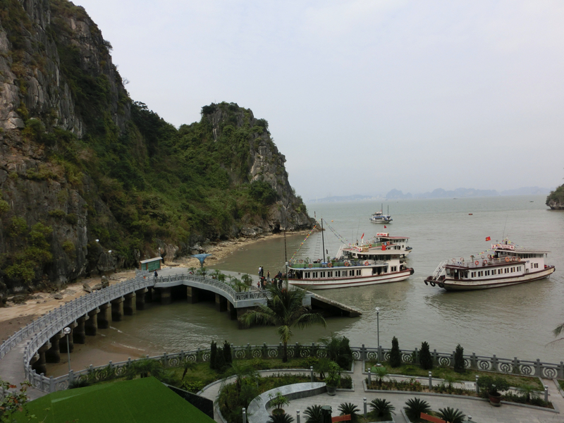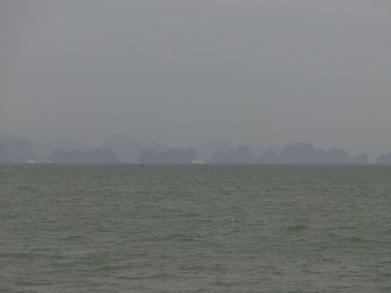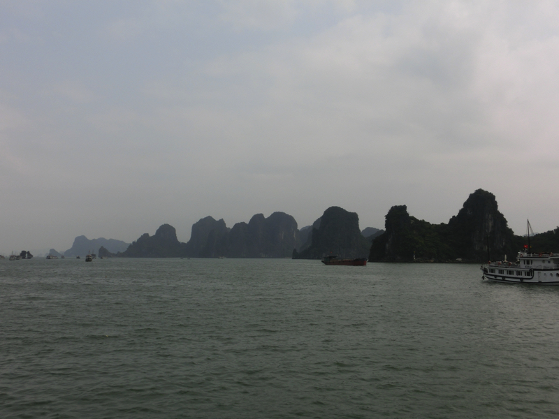 バスは出発。そろそろ周りの人たちが分かってきた。OLさん2人組、同じ会社らしきおじさん4人、卒業旅行の女子4人に一人旅の女子1人。この一人旅女子は同じホテルから乗ったな。何かの縁で一緒になったので、みなさん今日1日よろしくお願いします。2時間ほどして、バスは海沿いを走る。このあたりからは遠くにハロン湾の巨大な奇岩がうっすらと見えている。そしてようやく港に到着、たくさんのバスが停まっているがターミナルの中はすごい人。こんなに人が多いのか・・おそらく8割は中華系。その中をガイドさんについて行き、われわれの乗る船に到着。とにかく乗り込み、ほっと一息。われわれで半分くらいの席がうまったがしばらくして欧米系の団体が到着。これで満席となり、出発だ。