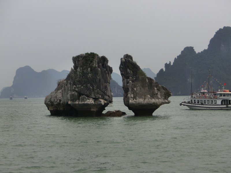 周りにはたくさんの奇岩が見えている。ここハロン湾には大小約2000の岩があるらしい。日本の松島は約260なので、その規模はさすが世界遺産。遠くの方まで奇岩があるのがうっすらと見えている。近くに見える岩には様々な形があるが、もっとも有名なのがこの香炉岩。20万ドン札にも印刷されているくらい、ここハロン湾のシンボル的な岩のようだ。そしてもう一つ有名なのが、この闘鶏岩。鶏が向かい合っているようで、闘鶏にも見えるがオスとメスが見つめ合っているようにも見える。
