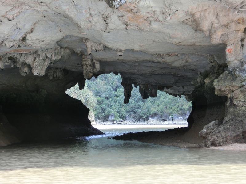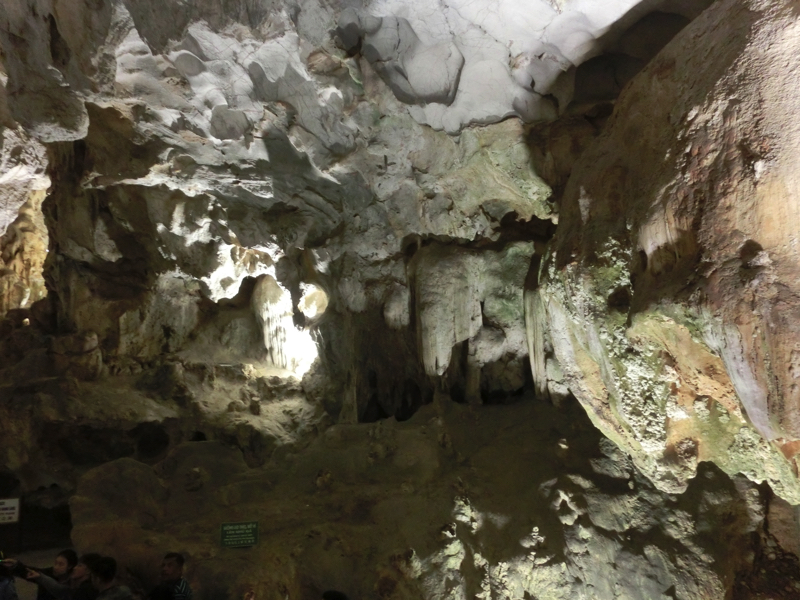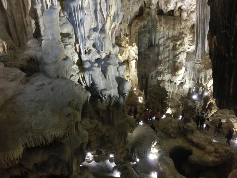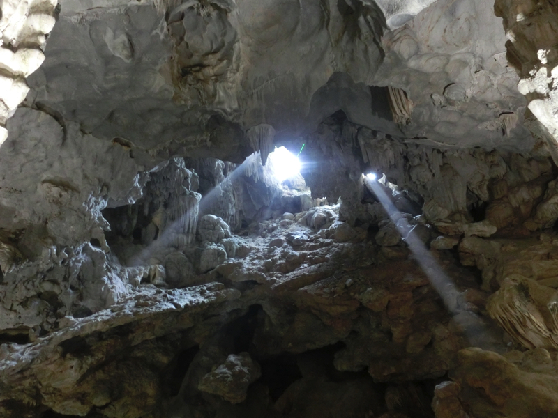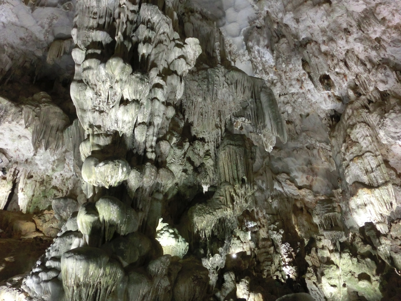 その後数分程度で、船着き場に到着。ここから、ティエンクン洞窟へと向かう。ティエンクンとは天宮の意味で、洞窟内に光が差し込むところがあってそこからこの名前が付けられたとの説があるらしい。中に入ると、早速たくさんの鐘乳石が見える。象の形や亀の形など、説明されればそうかな、と思えるものがあったり長い年月をかけて滝のようになっていたり、自然は不思議です。途中、光が差し込むところが確かにあり、天から降り注ぐ光のようにも見える。これが天宮という名前の由来かな。