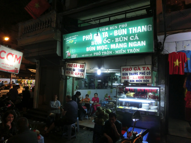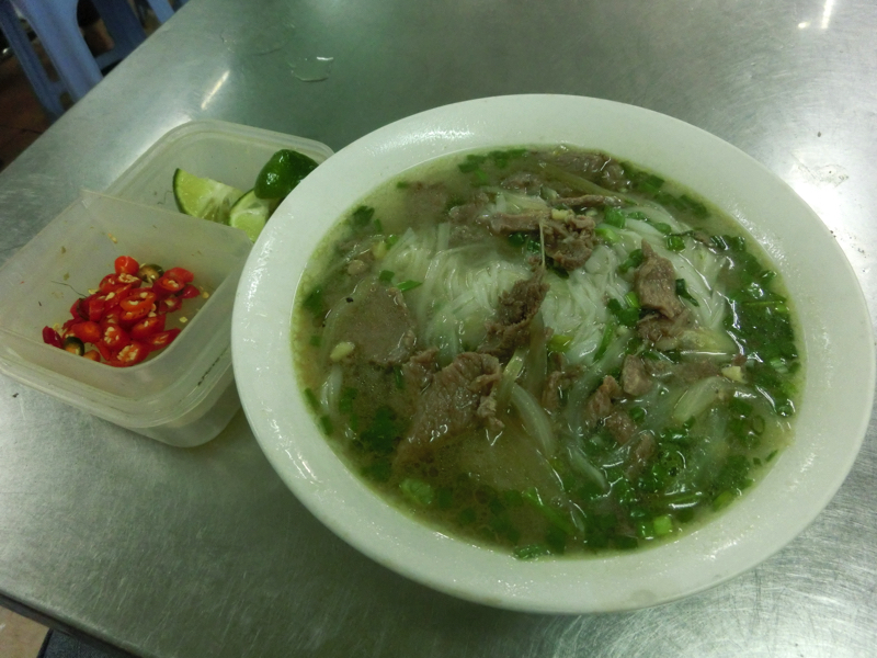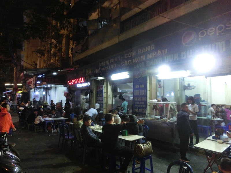 往復のバスが約9時間、現地でのツアーは4時間ほど。長い一日でした。とはいえ自力ではなかなか行きづらい場所だし、ハノイといえばハロン湾という思いもあったので行けてよかったな。天気も悪くなかったし、楽しかったです。さて、では夜ごはん。疲れた割にはそんなに空腹感がないので、今日もフォーでも軽くいただきますか。ホテルの周りにはあまりお店がないので、昨日と同じく湖畔あたりへ行ってみる。で、昨日は行っていないあたりを歩くと、いくつかローカルらしいお店が並んでいた。ざっとみて、空いてそうなお店に入ってみる。お客さんは地元っぽい人が多いが、欧米系の人もいたりいい感じ。牛肉のフォーを頼むと、フォーとともにタッパに入ったライムやチリが出てきました。このローカル感、いいですね。昨日も思ったが、ハノイのフォーはちょっとあっさりめなのかな。大阪と東京の味付けが違うように、ハノイとホーチミンで違うこともそりゃあるよね(40,000)。
