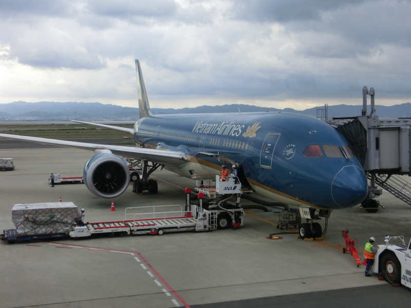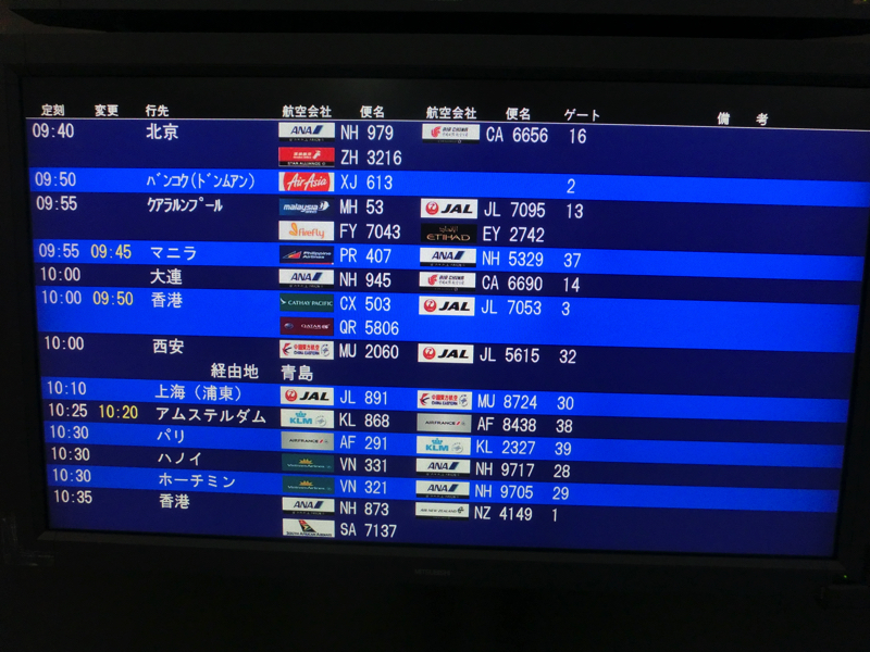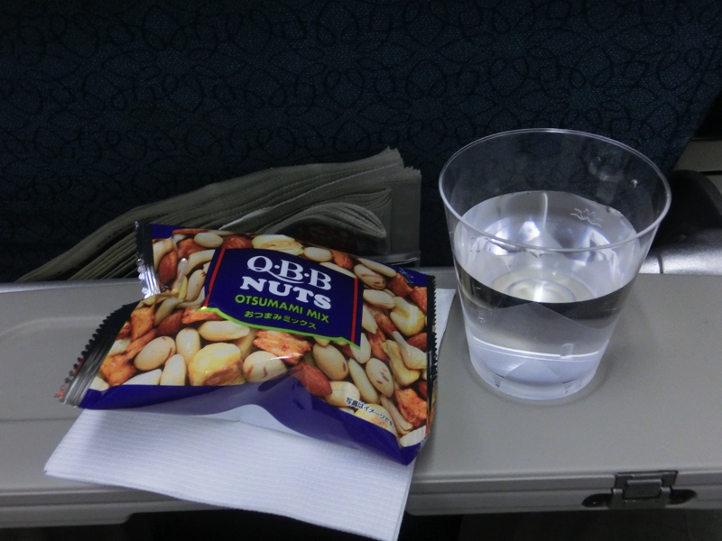 今日10時発の香港行きにM山さんがいるはずなので北ウイングのゲートに行ってみるが、やっぱり数百人いるところから探すのは厳しいな・・今ここにいるかどうかもわからないし、こちらは南ウイングなので戻らないといけないしであまりゆっくりも探せず断念。ハノイ行きのゲートへ行きますか。途中でお土産、30人以上いるのでここはベタだけど「白い恋人」で。嫌いな人はいないでしょ。さて、搭乗開始。窓際席でがっつり落ち着きましょう。機内はそれほど混み合ってはおらず、3列の真ん中席はだいたい空いている感じ。まずはおつまみだが、今日はこの後仕事なのでビールは自重、水でいいや。