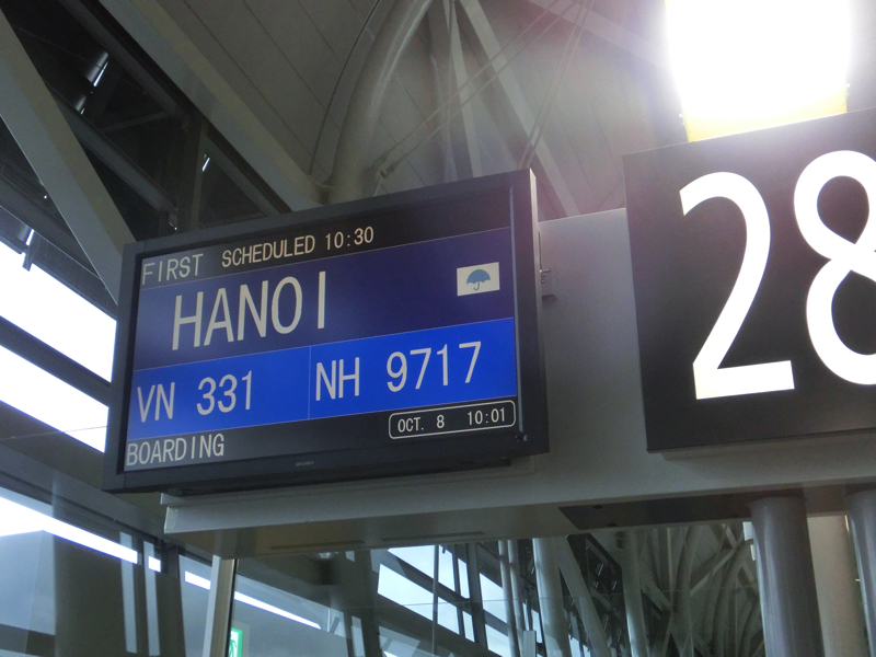 〜ハノイへ〜 8月のホーチミンから約1.5ヶ月、次の目的地はハノイオフィス。ホーチミンと同じ10:30発なので家を7時に出てちょうどいい感じ。オンラインチェックイン済みが今回は効果あり、すぐに手続きが完了しました。出国手続きは初めて顔認証のゲートを使ってみる。普通のゲートの方がほぼ人がいなくて早いんだけど、まあ一度やっておいた方がいいしね。なんの問題もなく完了、とはいえスタンプは欲しいのでカウンターで押してもらってOK。出発ロビーに入ると、この時期やっぱりありましたラグビーワールドカップのオフィシャルショップ。いいね。