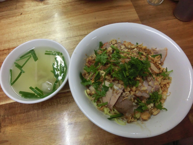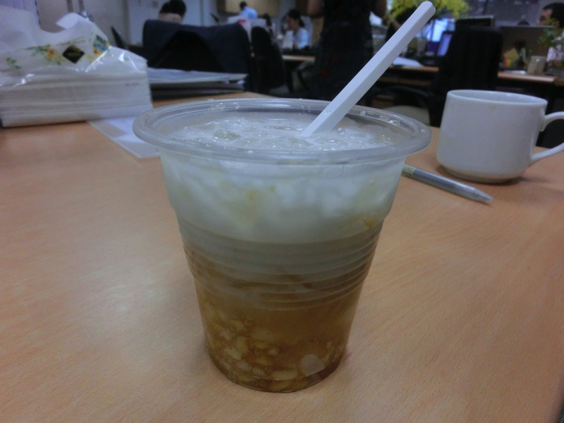 日本人スタッフが3日間いろいろ連れて行ってくれました。水曜は近くの「まぜ麺」屋さんへ。卵麺か米麺かを選び、汁無しか汁有りかを選ぶ。ここはオススメの汁無し卵麺で。少しピリ辛で、ベトナムらしく香草がたっぷり入っていておいしい。普通サイズで40、ざっと200円といったところ。安くておいしかったです。3時のおやつにはオフィス内にベトナムスイーツであるチェーが配られました。ヘルシーなスイーツだことで。