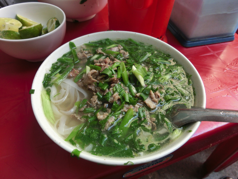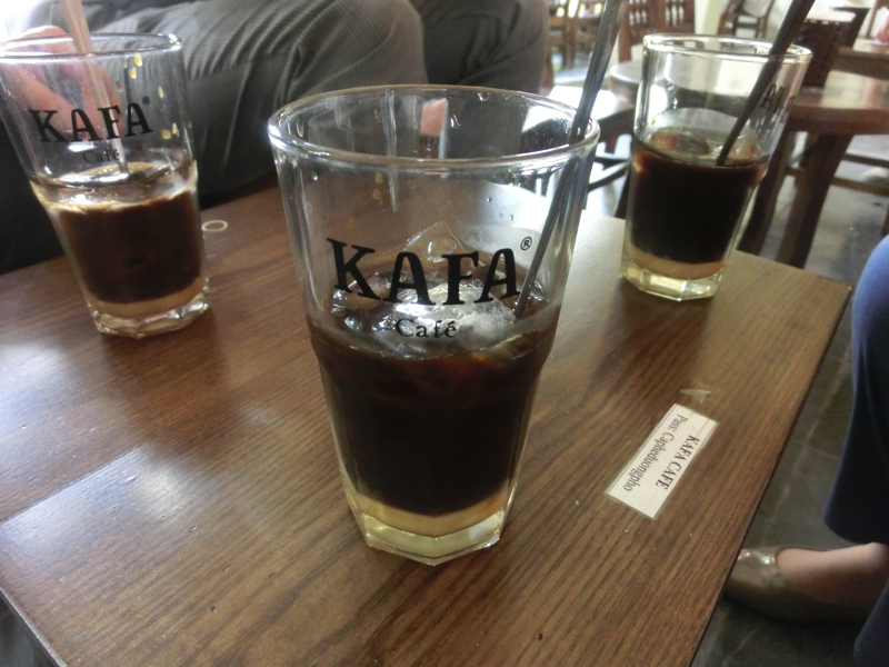 金曜はオススメのフォー屋さんへ。タクシーで数分程度で到着、地元の人もたくさんいるようだ。ハノイのフォーは割とあっさりしたのが多いが、ここのは牛のダシがしっかりとして少しニンニクも入ったがっつり系の味わい。肉もネギもたっぷり入っておいしいです。60なので300円ほど、こういうお店にしてはちょっと高めらしいがそれでおいしいので満足です。食後には近くのカフェでベトナムコーヒータイム、こちらは28なので140円ほど。
