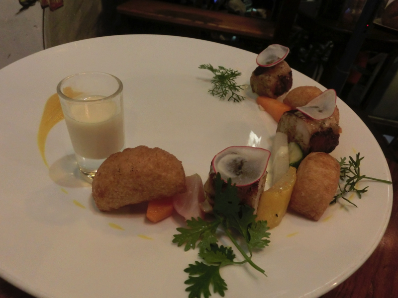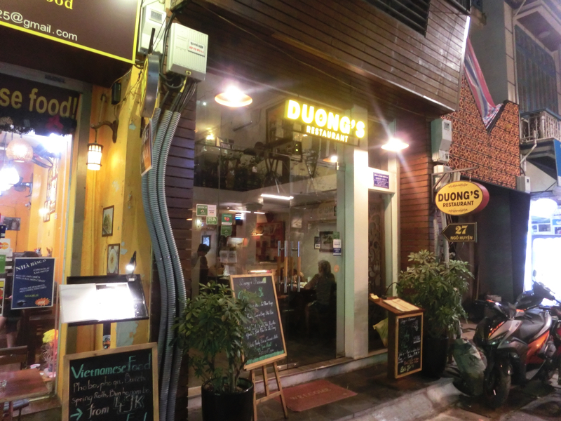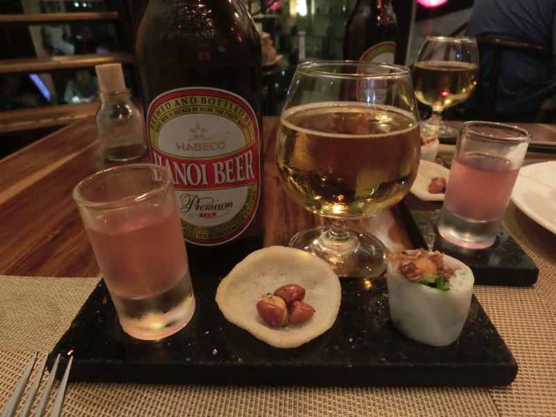 日替わりでいろいろと連れて行っていただきました。火曜はI井さんと2人でオススメのDUONG'Sへ。ビールはハノイとサイゴン両方味わい、軽めのハノイと苦めのサイゴンそれぞれおいしい。かなりおもてなしレベルの高いお店で、食材の説明やアレルギーの有無確認、バインセオを小分けにしてくれたり口直しのシャーベットが出てきたり、いい雰囲気でした。最後タクシーのところまで案内してくれたしね。これで一人400、2000円ほど。