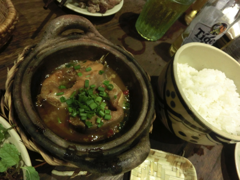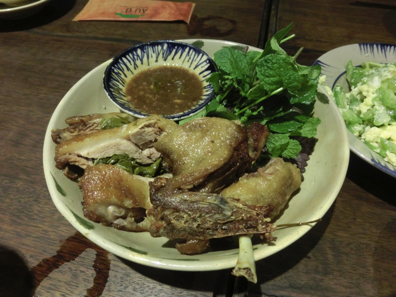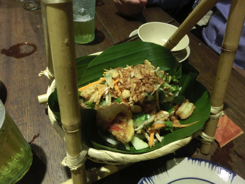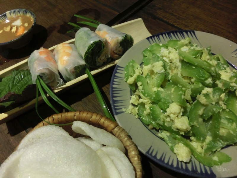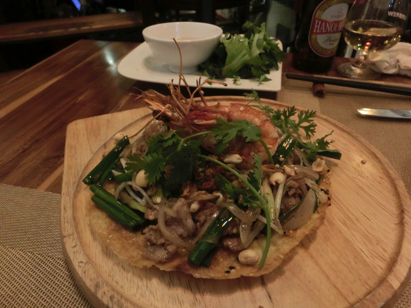 木曜は拠点長のSさんも帰ってきて、がっつり夜を楽しむモードへ。ベトナム人スタッフも含めて6人でAU Oにていろいろ飲んで食べてする。やっぱり生春巻きはうまいし、ゴーヤの炒め物がさっぱりほろ苦でいい感じ。アヒルの揚げ物も意外とクセなく行けるし、ベトナム風の角煮のようなのは味の濃い緑の野菜とともに楽しむ。エビのサラダはたっぷりナッツとの相性がビールにぴったり、そしてバインセオは大きなサイズ、これをライスペーパーに綺麗に巻いて持ってきてくれました。こうやって食べるものなんだったんだね。