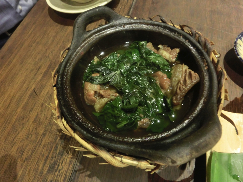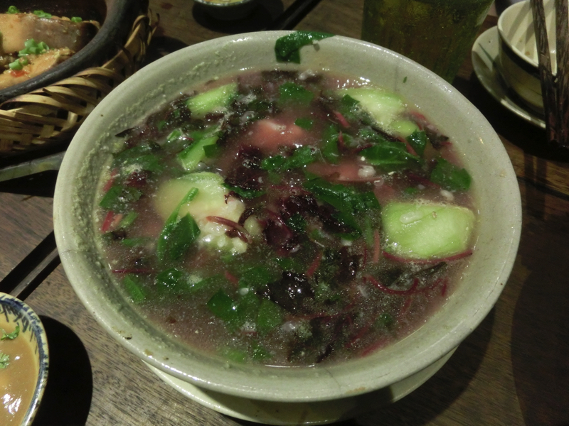 まだまだ食べる。川魚ぶつ切りの煮物、やっぱり淡水魚のクセはあるが白ご飯とあう。冬瓜や香草などを煮たようなスープもあり、これはご飯にかけて食べるのがいい感じ。大きめのオクラの素揚げにつけるマヨネーズソースがちょっと辛くておいしいし、明石焼きのようなものはタニシの卵とじのようなもの。あまりタニシ感がないが、これもおいしかったです。たくさん食べて、そしてカラオケ、夜中まで騒ぎました。