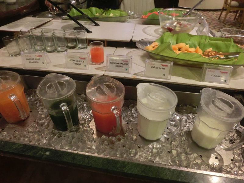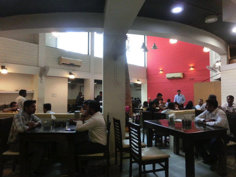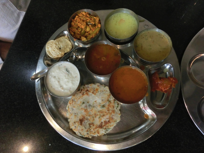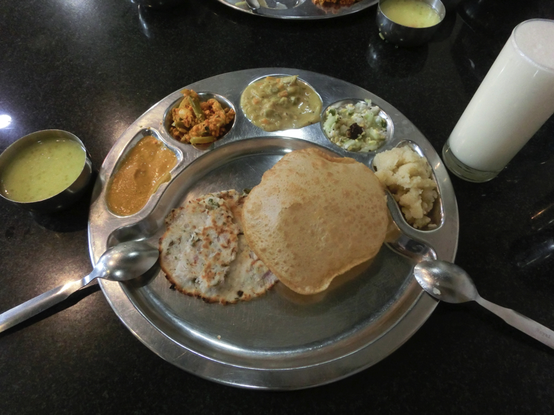 〜昼ごはん〜 13時を回り、Gさんとともにランチへと向かう。地元の有名なお店らしいMTRというところに行く。ここのランチは決まった量の「Mini Meals」と種類も多く追加し放題の「Special Meals」の2種類。せっかくなので追加し放題の方を選び、最初にショットグラスでブドウ?ザクロ?どちらかわからないジュースをいただく。続いては何もない銀色のお皿が出てきました。そしてこのあとはいろんなカレーやスープ、プーリという薄いクレープのようなもの、ヨーグルト風味の野菜、などなどを各テーブルを回りながら順番に配っていく。これは無限、配られるまま全部食べていたら終わらないので、好みのものはしっかり食べ、イマイチのものは無理には食べないようにしよう。約30分ほどの時間、ずっと食べていたかな。これはとにかく満腹になった・・・ちなみにメニューに書かれていたのは以下の通り。ごちそうさまでした。オフィスに戻り、もう少し仕事。