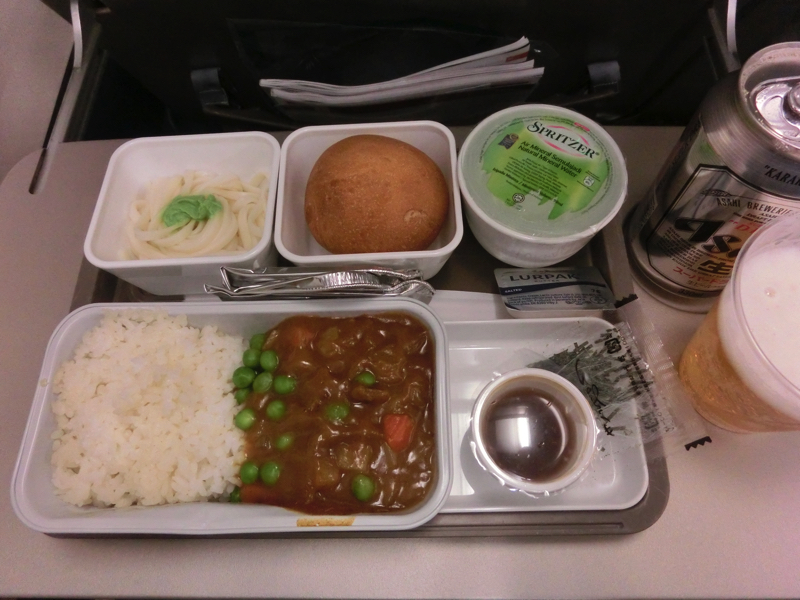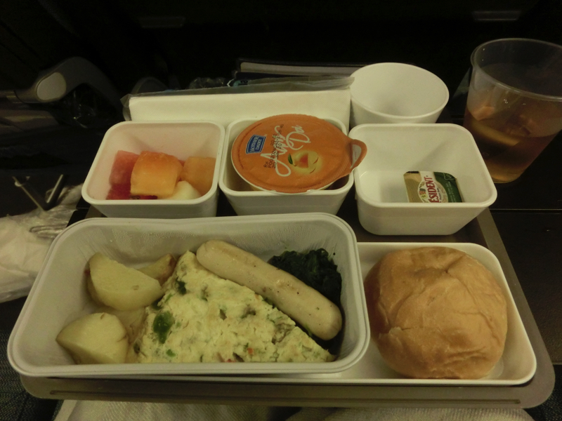 〜香港到着〜 結局1時間近く遅れて出発。夜中の2時を回っているので、さすがにしばらくはドリンクサービスも機内食もないだろう。この3日間は睡眠不足だし、とても眠いのでひたすら寝ましょう。座席は3-4-3だが後方で3-3-3になるところの中央列の通路側を取っていたのは夜間でも動きやすくするため。でもこの後方ブロックはがらすきで、結局その真ん中の3列を丸々使うことができました。ゆったりできてラッキーだな。ビールとナッツをいただき、ここまでの旅の無事に乾杯。すっきりしたところで眠りに落ちる。結構寝られたかな。朝になったので、到着前の機内食サービスがスタート。ベジかオムレツかなので、もちろんオムレツ。ソーセージはチキンかな。まあ、朝なのでこんなものでしょう。そして香港に到着したが、なにやら機内が慌ただしい様子。後方ブロックの前の方にいる人が体調不良なのか、救護スタッフが入ってきた。その影響で乗客はしばらく座席で待機。これ、関空行きの早い乗り継ぎ便もあったのだがそれだと乗り継げないかも・・その後20分くらい経ったころ、ようやく飛行機を出ることができた。体調不良の人は大丈夫?早い便の乗り継ぎはできたのかな?