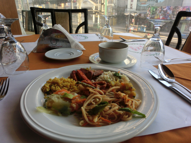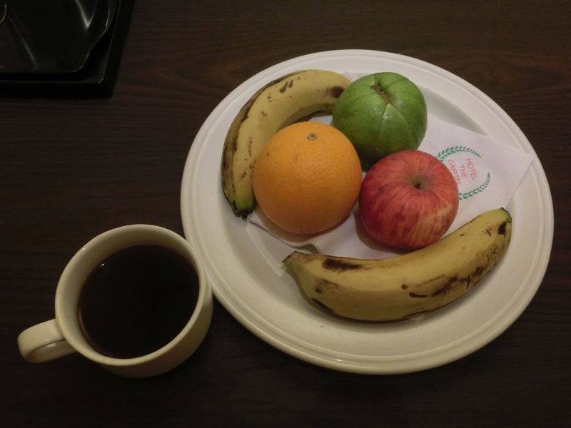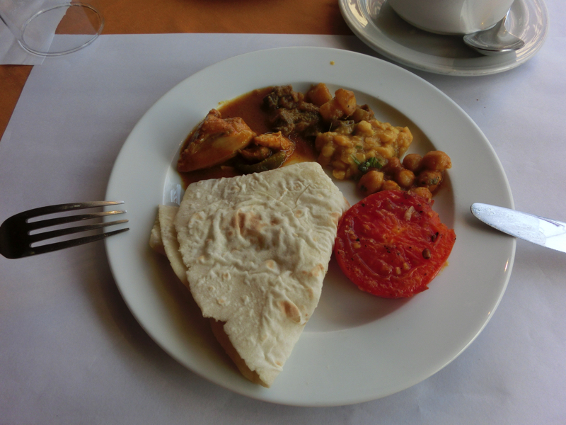 〜朝ごはん〜 4時過ぎに目が覚めた。ちょうど仕事もできるのでいい感じだ。ひと段落したところでシャワーを浴びるのだが、昨晩水だったのが今日はちゃんとお湯。どうやらスイッチ横のランプは切れているが、温かくする機能自体は生きていたらしい。ちょっと時間がかかるんだね。ということで、熱いシャワーを浴びる。やっぱりこれだね、と思っていたらだんだんぬるくなるような気が。なので止めながら浴び、何とか温かいうちに浴び終わりました。これ、とても2人とか女子とかは厳しいよね。7時を過ぎ、朝ごはんへ。フロント前のレストランへ行くと、一番乗りでした。お国柄か、冷たい料理は野菜くらいであとはすべて温かい料理。その方が安全だしね。カレー系の味付けで、野菜や豆が中心だがチキンもあり、一通りおいしくいただきました。デザートは部屋にあったフルーツセットとコーヒー、とはいえこんなに食べられないのでバナナだけいただきました。
