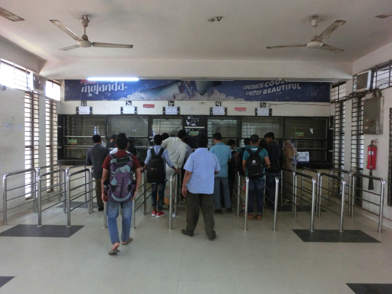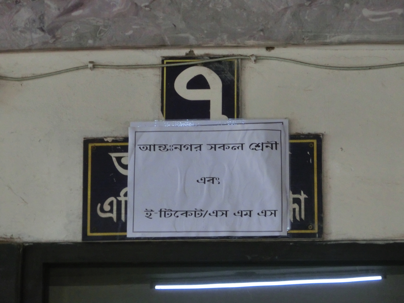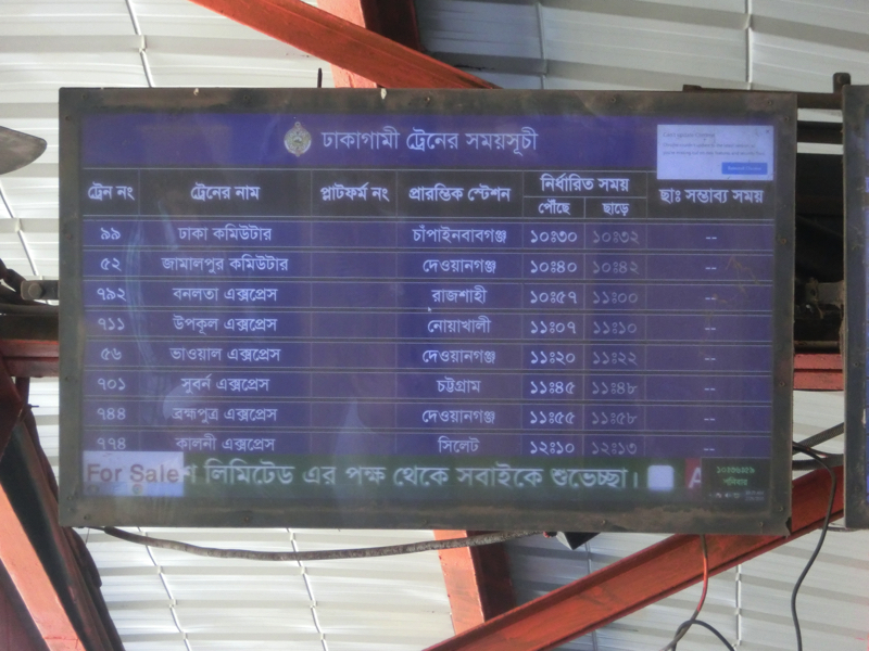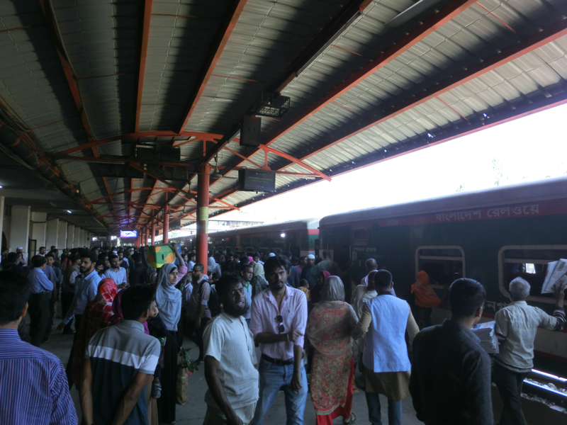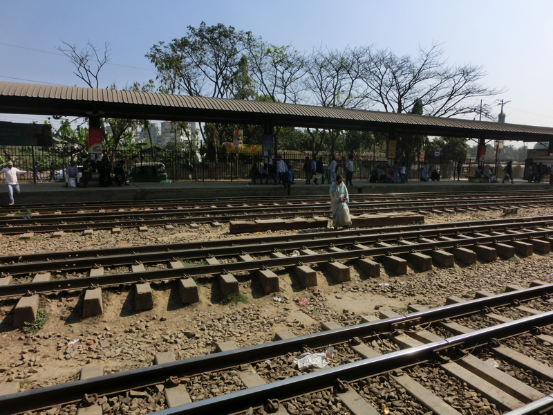 〜空港駅を見る〜 駅について切符売り場を見ても、ベンガル語オンリーなので数字すらわからない。そしてホームに入るとたくさんの人。うーん、これは見るものであって乗るものではないなあ。駅につく少し前に列車が見えたので、しばらくは来ないかもしれない。でもこの人の多さだし、モニタの案内を見ている人もいるし・・その案内は、まったくわかりません。まあ時間もあるので、しばらく待ちましょう。駅の雰囲気を見ながら15分くらい待ったが、特に何も変わらず。そろそろ戻った方がいいかなと思い、駅を出て歩道橋を上がろうとすると踏切が閉じるのが見えた。これはもうすぐくるな。駅に戻りしばらくすると、警笛を鳴らしながら列車が入ってきました。長い車両の列車で、結構乗り降りはあるようだ。でもドアにぶら下がるとか屋根に上るとか、そこまではない。ちょっとは期待したけど、さすがに土曜の昼間にそれはないか。でも駅の雰囲気を味わえてよかったです。では空港に戻りましょう。