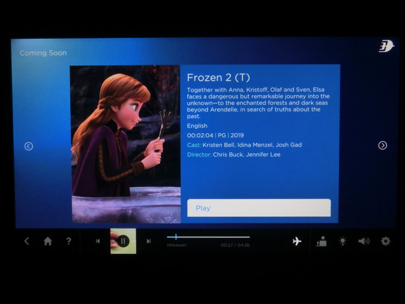機内の後方のエリアはぱらぱらと空席がある。とはいえ座席も最新だし、モニタも大きいしこれなら夜行便でも十分だ。すぐにスタートした機内食はビーフ&ライスかチキン&パスタ。ここはビーフで、赤ワインいただきながらゆったりしますか。わりとしっかりしたハンバーグで、赤ワインにもあうのでいいな。映画はいろいろあるが、Coming soonのところにアナ雪2があった・・見たかったなあ。次の出張くらいには見られるかな。