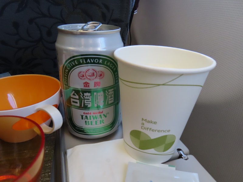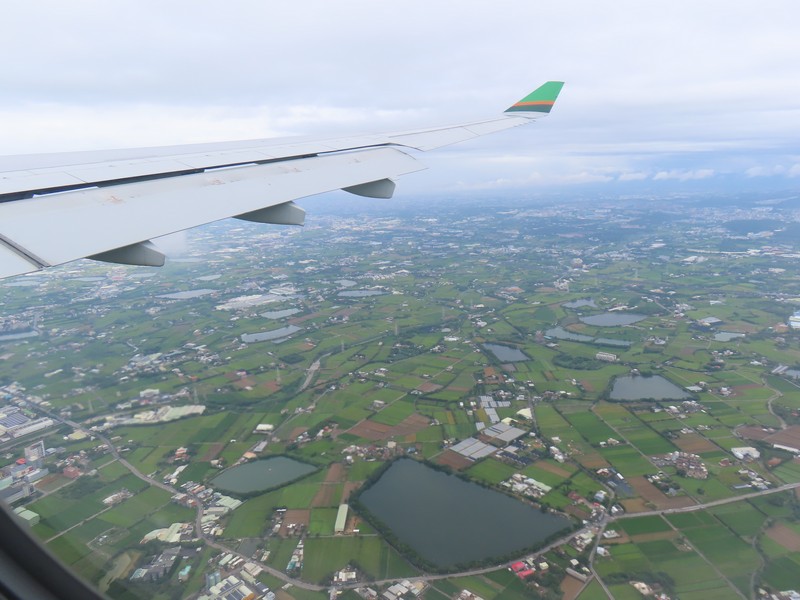 離陸後、しばらくすると機内食サービスがスタート。さすがに台湾便だとフライト時間が短いので、ドリンクサービスはなくいきなり機内食ですね。特に選択肢はないので、出されたものをいただきます。肉や卵、厚揚げなどを煮込んだもののオンザライス、台湾らしい風味がする。中途半端に凝った料理ではないので、シンプルにおいしいです。中でも手前にあるすり身を揚げたようなのがおいしいかな。蓮根のピクルスを途中でつまみながら食べるが、半分くらい食べた頃にようやくドリンク登場。ここはやっぱり、台湾ビールでお願いします。食後はコーヒーをいただきながら、エンタメを楽しむ。画面も小さいし種類も少ないが、短距離便だとこんなもんかな。「イチケイのカラス」を見たが途中で時間切れ。続きは帰りに見ようかな。飛行機は高度を下げ、緑の広がる台湾の様子を見下ろしながら台北桃園国際空港に到着だ。