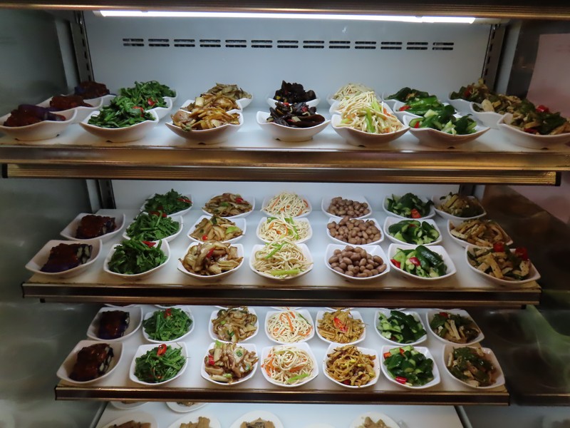 少し休憩し、出かけますか。このホテルはそのまま地下に入れるので便利だ。券売機でコインのような切符を買うのだが、これが随分と軽い。持っていることを忘れそうになるので注意しないとね。地下鉄に乗り、まずは東門まで。地上に上がると、年季の入ったビルも多く、カラフルな看板や窓下の室外機の多さが台湾らしいイメージだ。上海はすっかり変わってしまったが、台北は変わらずこのままでいてほしいな。そんな中、しばらく歩いて到着したのが「杭州小籠包」。インスタなどで見つけていたお店だ。まだ5時過ぎだがお客さんも多くいるようだ。ちょうど空いていた席に案内され、悩みながらいろいろとオーダー。メニュー以外には小菜があり、これは冷蔵コーナーから自由に選べる。ここからは茄子の冷菜をいただいておきましょう。あと飲み物もそこから選ぶパターンで、よくある温かいお茶はでてくる、というシステムではなく、実は台北は結構このパターンがあるようだ。