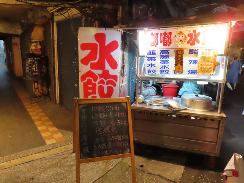 近くのコンビニで品定め。お土産用のお菓子など、何かないかな。試しにピーナツのクッキーでも買ってみよう(39)。東門駅に戻り、雙連駅まで移動。駅を出ると、小規模なお店が並ぶ賑やかなエリア。餃子屋さんとか、いろいろとおいしそうだ。途中、永豐銀行のATMがあったのでキャッシングチャレンジするも、VISA・JCBとも撃沈。困ったものだ。また別のところで試してみよう。さて、この駅の目的は餃子屋さん。嘟嘟水餃というお店だが、大通りを入った路地にあるなかなかの地元感あふれるお店。いい感じです。それなりにお腹はいっぱいなので、餃子とスープのセット一つをシェアしましょう。薄暗いテーブルで待っていると、すぐに登場。ニラたっぷりの水餃子が15個と、酸辣湯が結構たっぷり。シェアでよかった。餃子はニラがしっかり味わえ、水餃子なのでつるっとおいしい。酸辣湯はちょうどいい酸味で、野菜たっぷりで満足感がある。どちらもおいしかったです(130)。