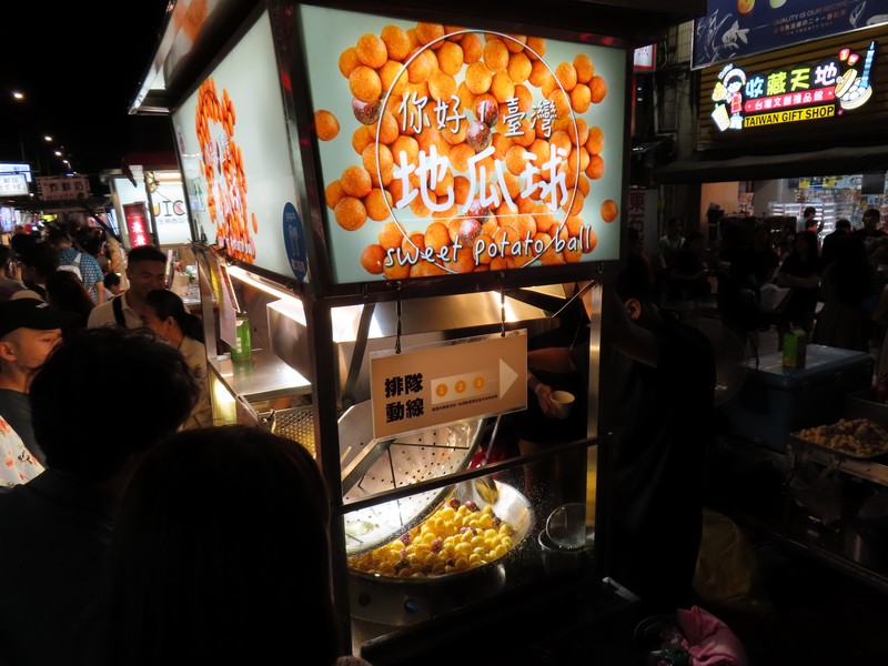 このまま雙連駅から離れていくように歩くが、ずっと通りは賑やか。途中見かけた鶏肉飯のお店も気になるが、さすがにもう入らないな。しばらく歩くと、さらに賑やかな通りに到着。ここは寧夏夜市という場所で、たくさんの屋台や飲食店が並び、地元の人や観光客が集まっている。いろいろとおいしそうなものはあるが、人も多いのでここに空腹で来るとちょっと大変かもね。今は満腹なので、夜市の雰囲気を楽しみながら歩きましょう。そんな中、気になったのが地瓜球。サツマイモをペーストにしてあげたようだが、QQのようにモチモチなのかな・・ただ行列がすごすぎて、今回は断念。またどこかで機会があればいただきましょう。一本道の通りにたくさんのお店があって、いろいろ見ながら歩くのも楽しいです。