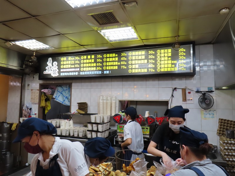 しばらく歩くと善導寺駅に到着。なにか行列があり、かなり長いと思ったらなんとこれから行く朝ごはんのお店への列。観光客だけでなく地元らしき人も含めて100人以上は並んでいるようで、どのくらいかかるのだろう。それなりには進むので待つしかない。しばらくして、ようやく市場の中に入り、階段を上がり、2階にあるお店・阜杭豆漿が見えるところまでやってきた。ガラス越しに次々と焼いているのが見え、それを大量に売りさばいているのだ。よく分からないままお店の人のおすすめと指差しで何とか注文完了(160)。テーブルの空いた場所を何とか見つけ、いただきましょう。ここは豆乳と揚げパンのお店で、いただいたのは鹹豆漿・厚餅夾蛋・蛋餅・豆漿の4種類。温かい豆乳に油条が入っていて、優しい味としっかりした食感。卵が挟まれた揚げパンは食べ応えあるし、冷たい豆乳をいただきながら熱い卵入りの薄い餅のようなのもおいしい。ここはフードコートなので他のお店のものを食べている人もいるが、この豆漿などを食べている人が多いかな。行列はすごかったが、確かに地元の人も行列を作るのが納得です。